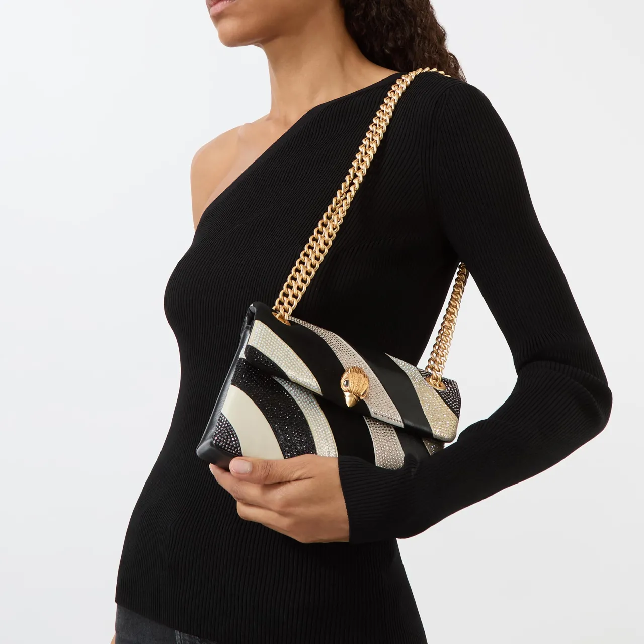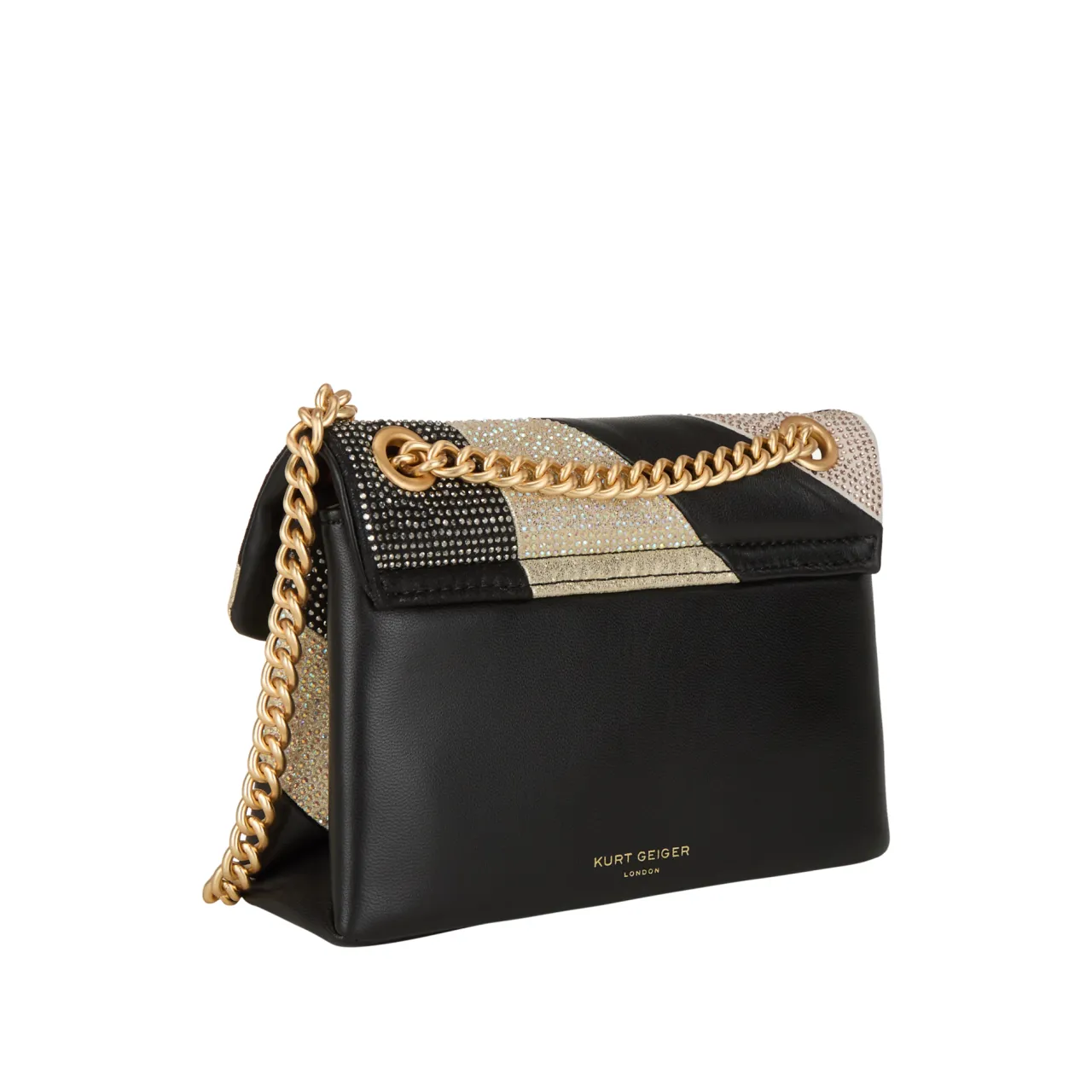 - Foldover flap closure, adjustable chain strap, secure snap-button fastenings, two-tone design, all-over crystal embellishment, gold-tone hardware, signature Eagle head detail, rear logo branding