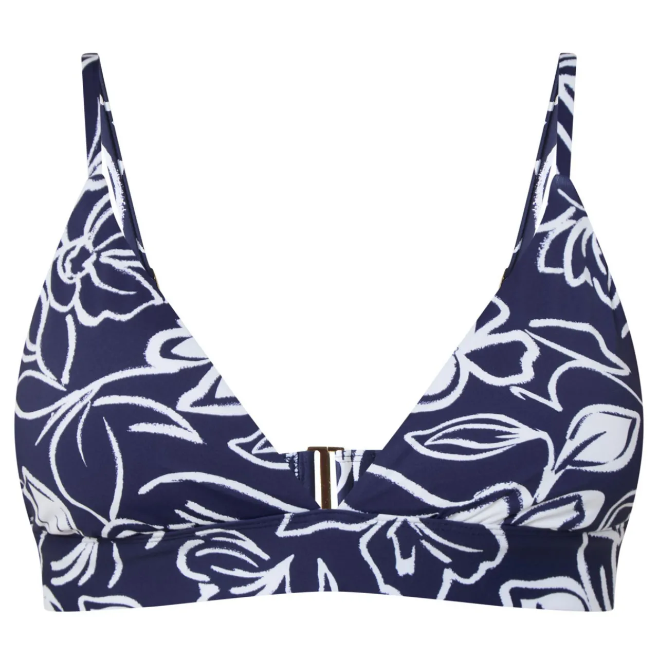 - Triangle-style design, fine adjustable straps, wide under band, rear clasp fastening, gold-tone hardware, Alora Floral print, two-tone design, smooth finish