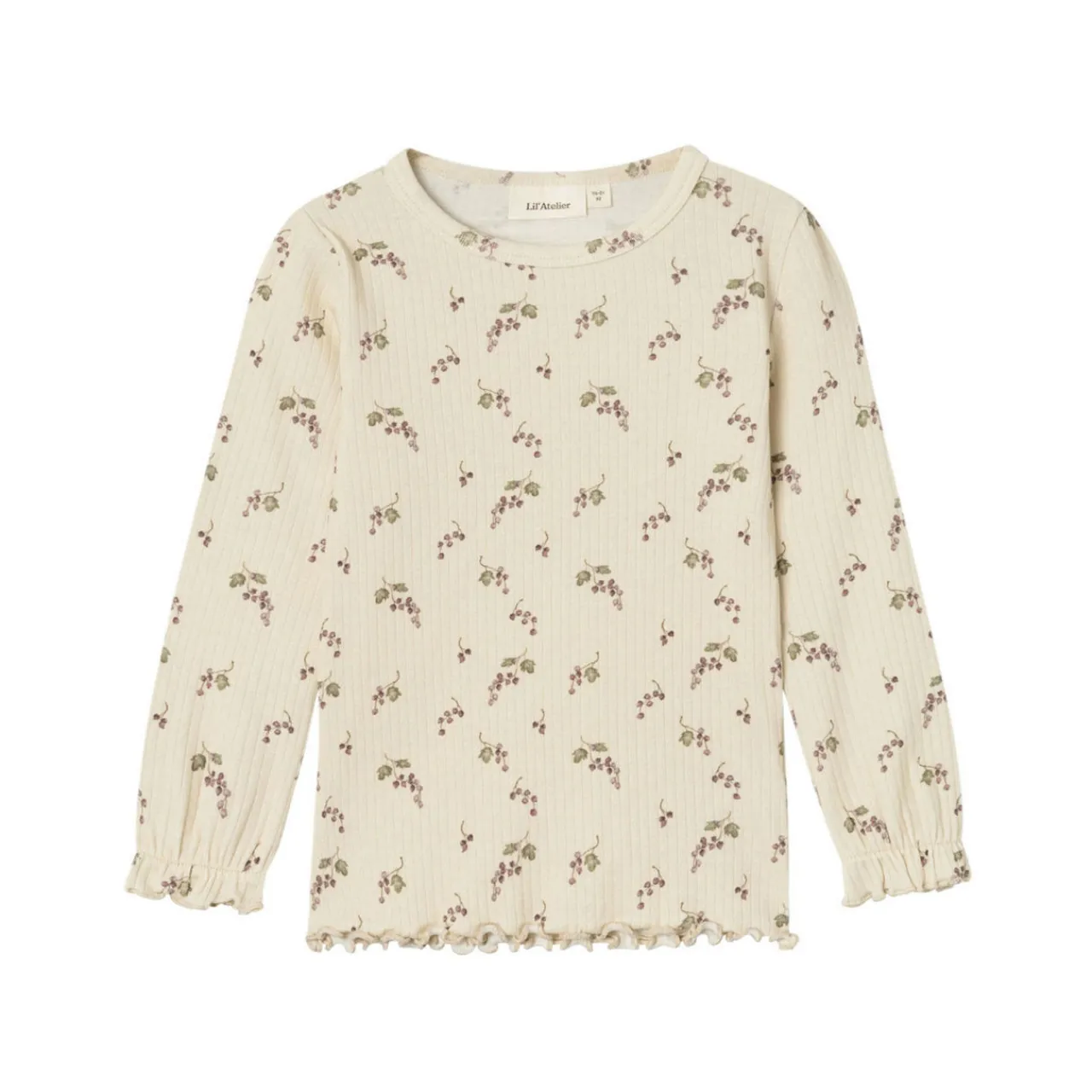 - Long sleeves, round neckline, berry print, ruffle cuffs and hemline, ribbed fabric