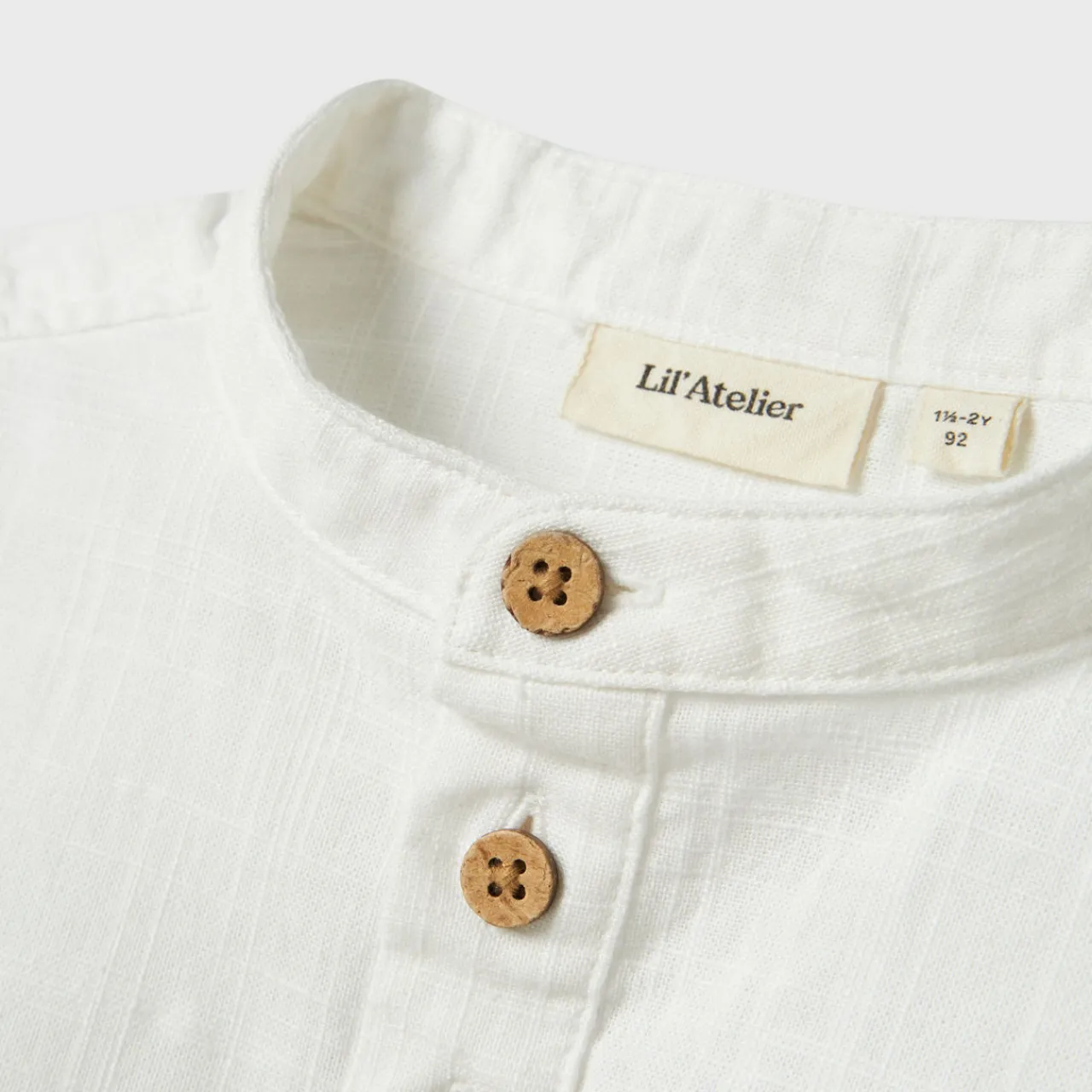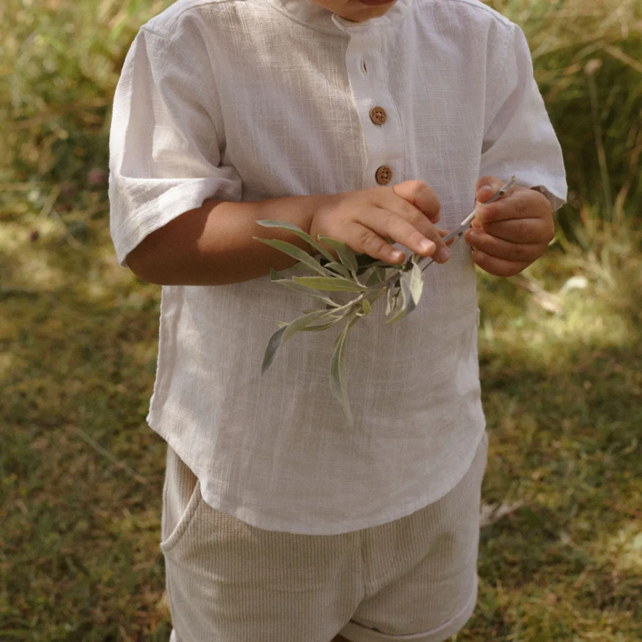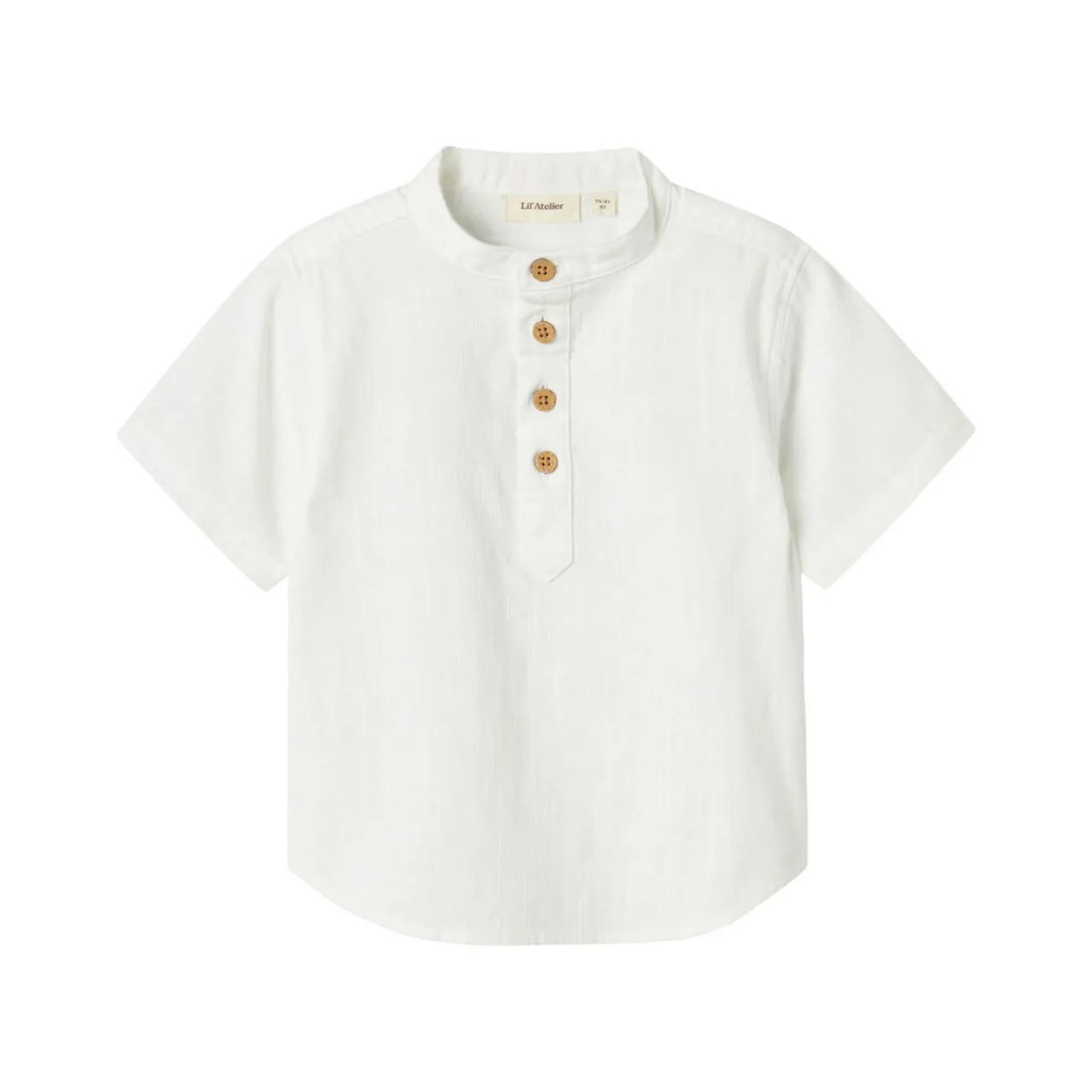 - Mandarin collar, short sleeves, half-button placket, tonal stitching, smooth fabric