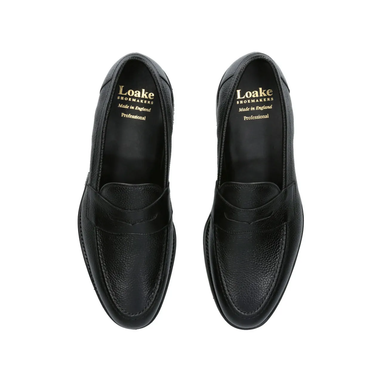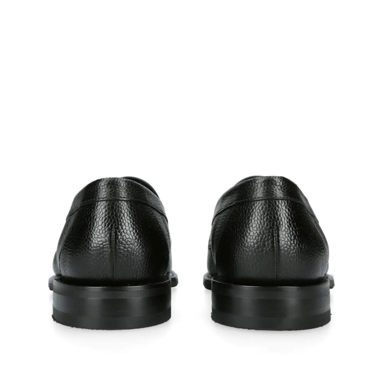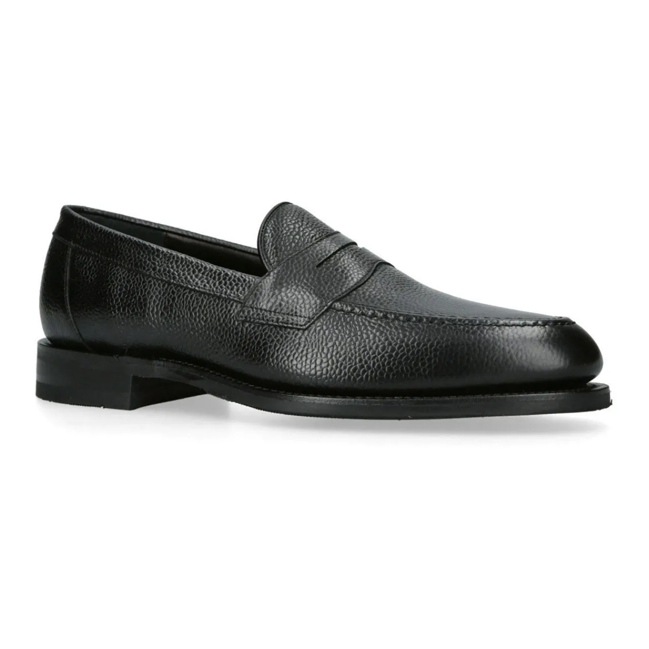 - Slip-on style, stacked heel, almond toe, penny bar detail, grained leather finish