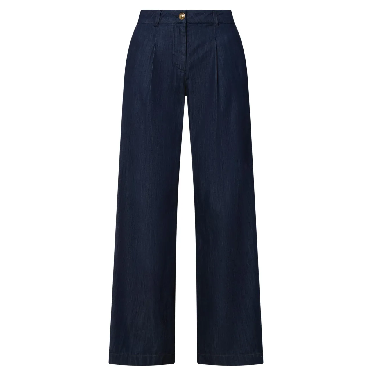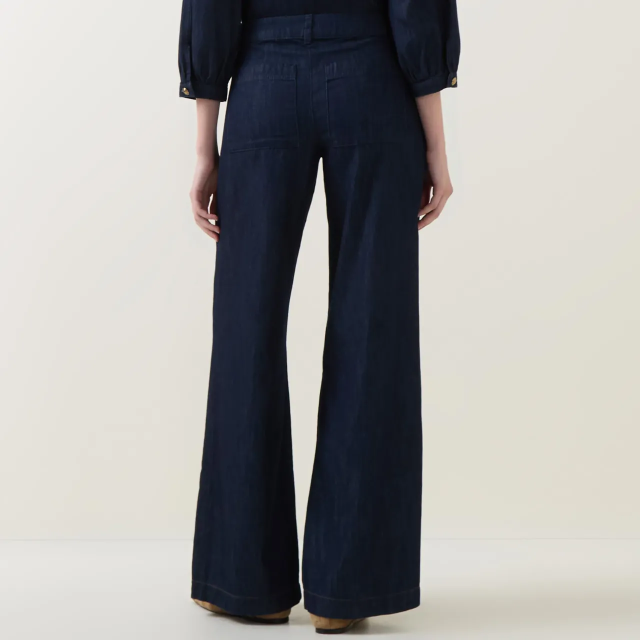 - Zip-fly and button fastening, belt loops, four-pocket design, tonal stitching, mid-rise, wide-cut leg, smooth denim finish