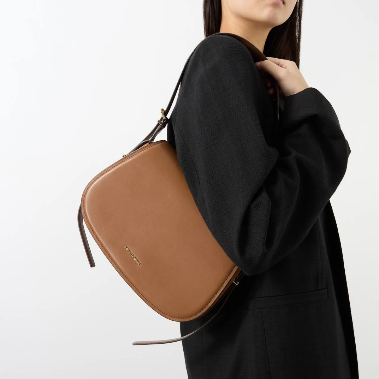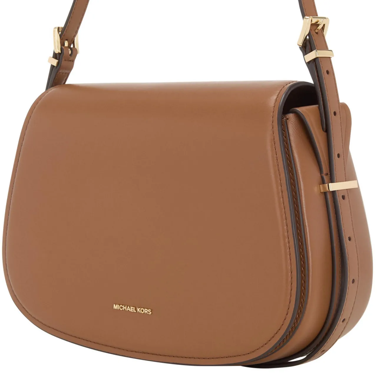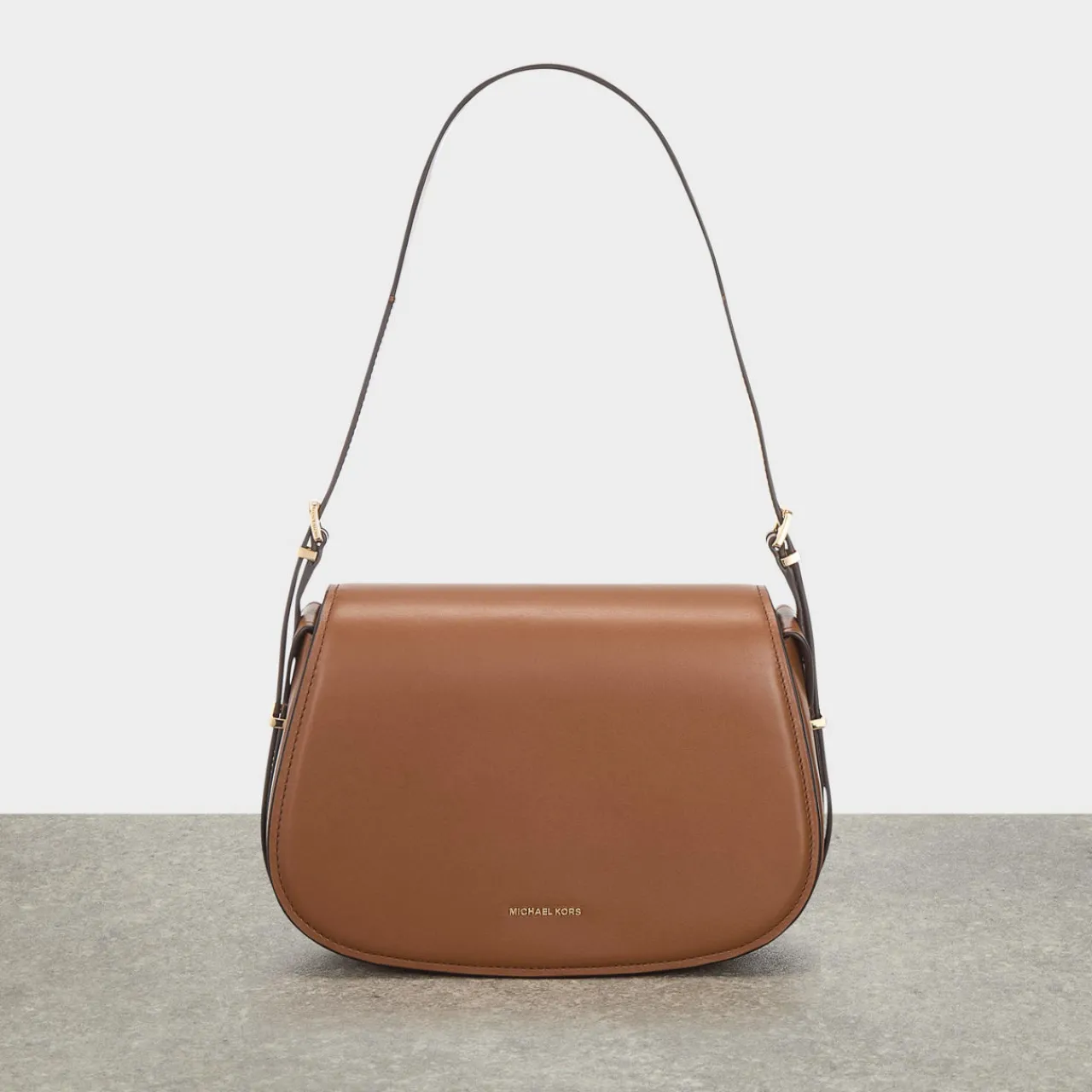 - Flap closure, magnetic dot fastening, adjustable shoulder strap, structured silhouette, gold-tone hardware, logo lettering, smooth finish