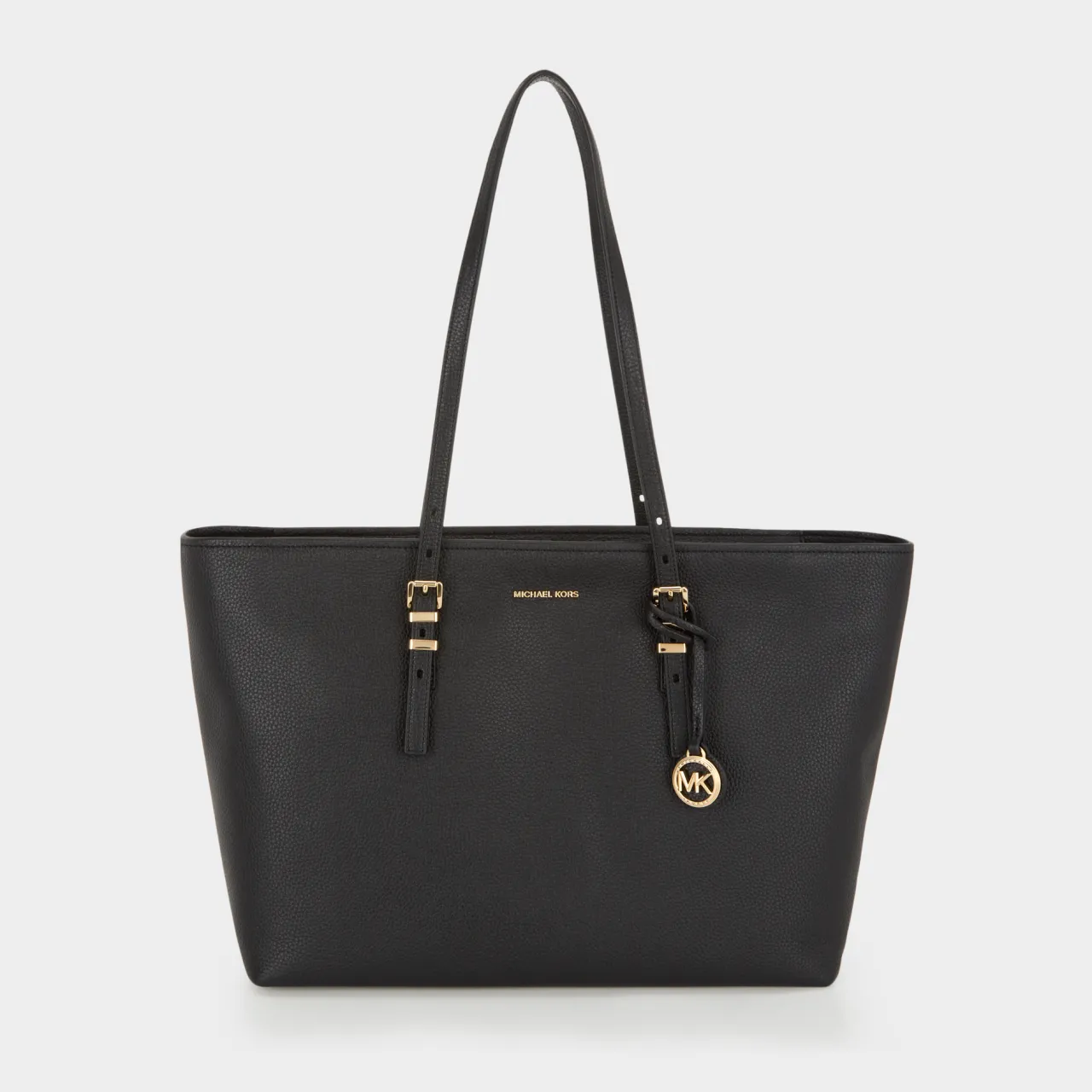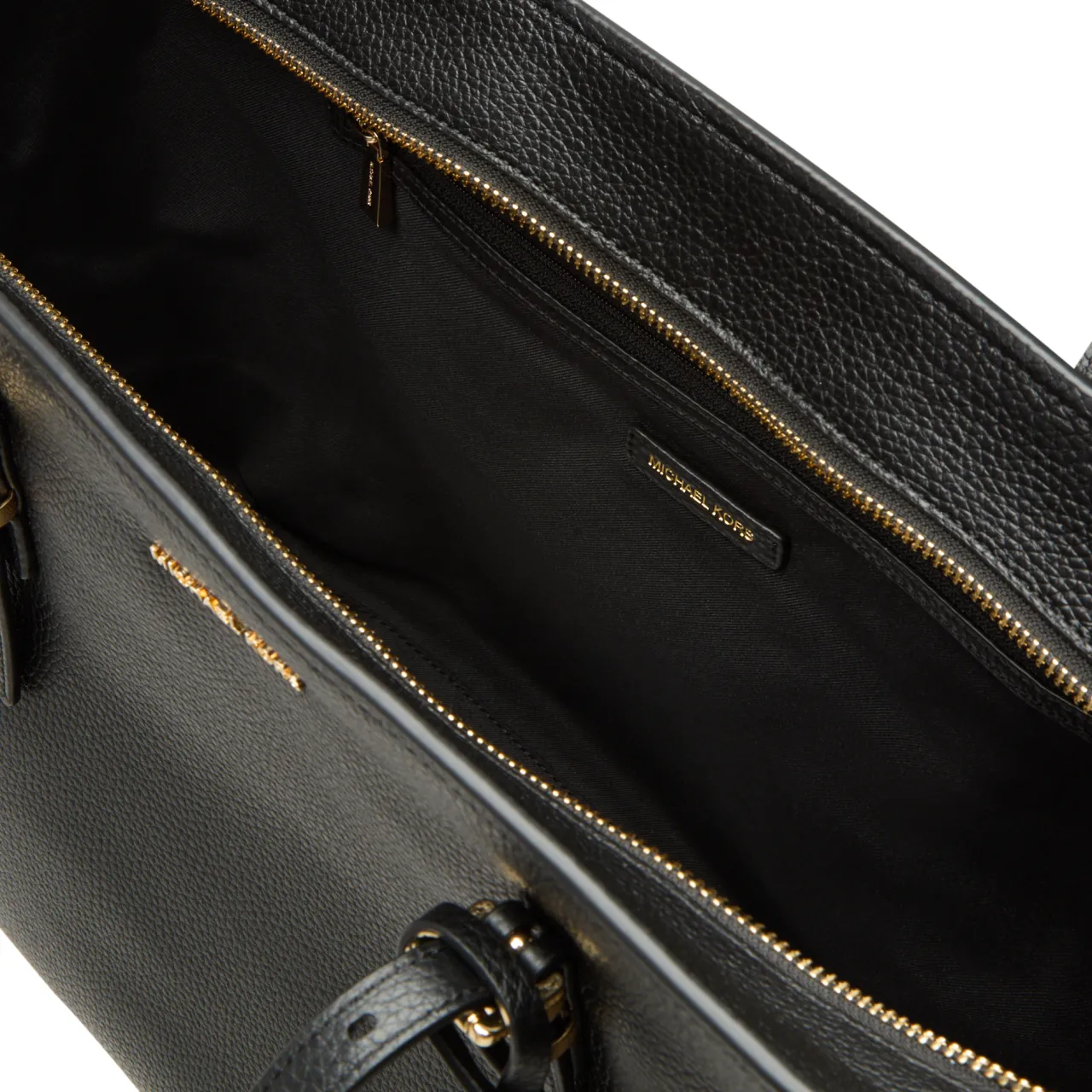 - Adjustable shoulder straps with buckle fastenings, top zip closure, one rear slip pocket, logo lettering, gold-tone hardware, hanging MK logo charm, tonal stitching, pebbled leather finish