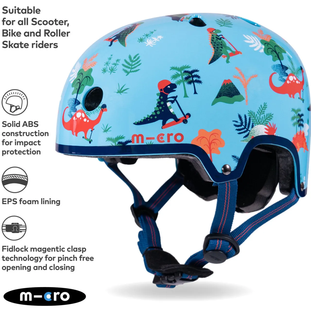 - Three essential accessories, dinosaur print design, solid ABS construction helmet with magnetic clasp fastening and integrated light, waterproof bell with loud ding sound, waterproof LED light