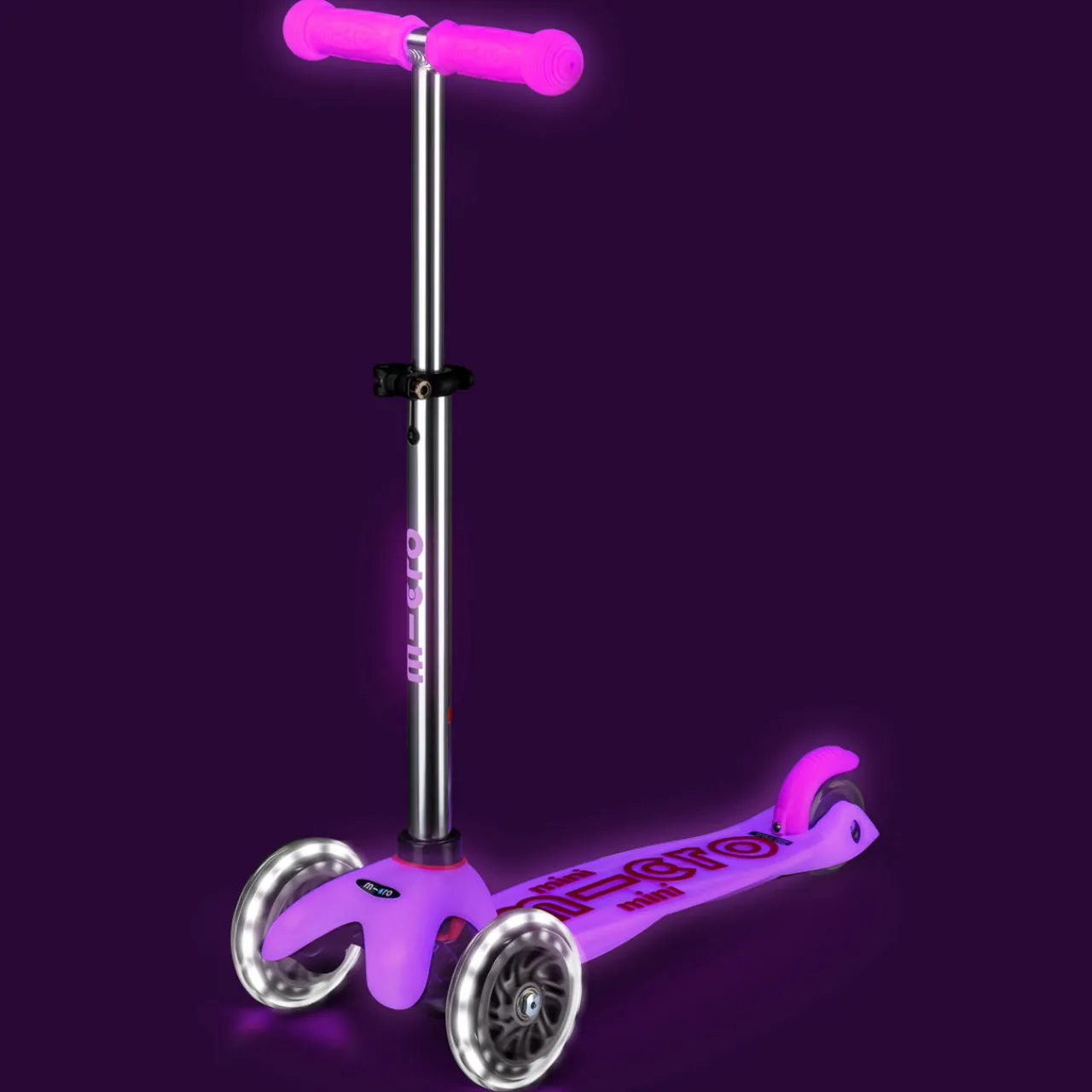 - Glow-in-the-dark deck, grips and brake, LED wheels, glow-in-the-dark micro stem logo, powered by sunlight, height adjustable handlebars, anti-slip deck, patented steering system, scooter, allen keys, manual