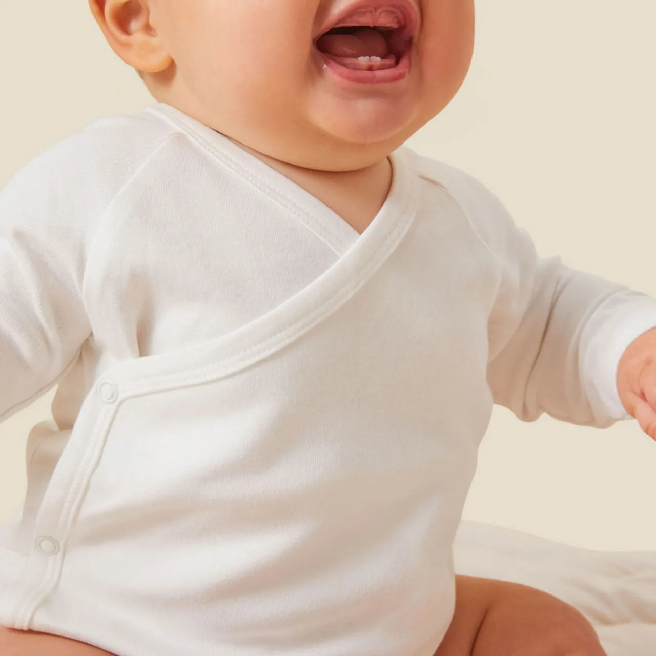 - Wrap-style front, signature soft fabric, breathable, long sleeves, fold-over scratch mitts, nickel-free popper fastenings, brand logo detail