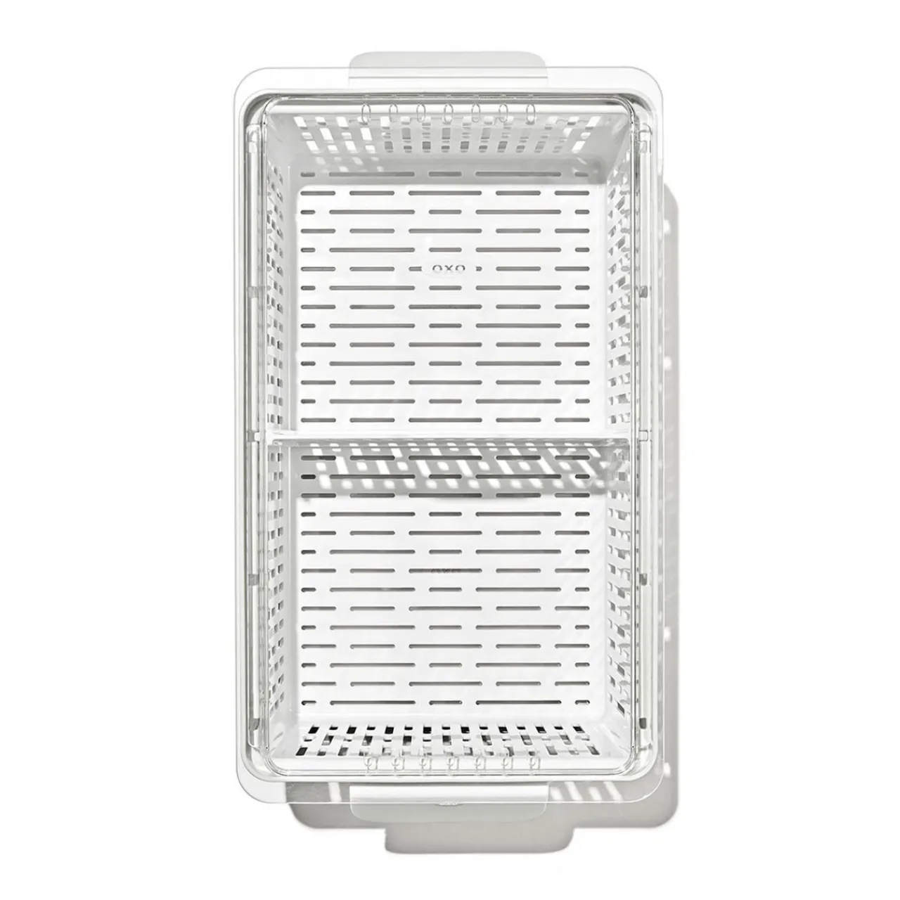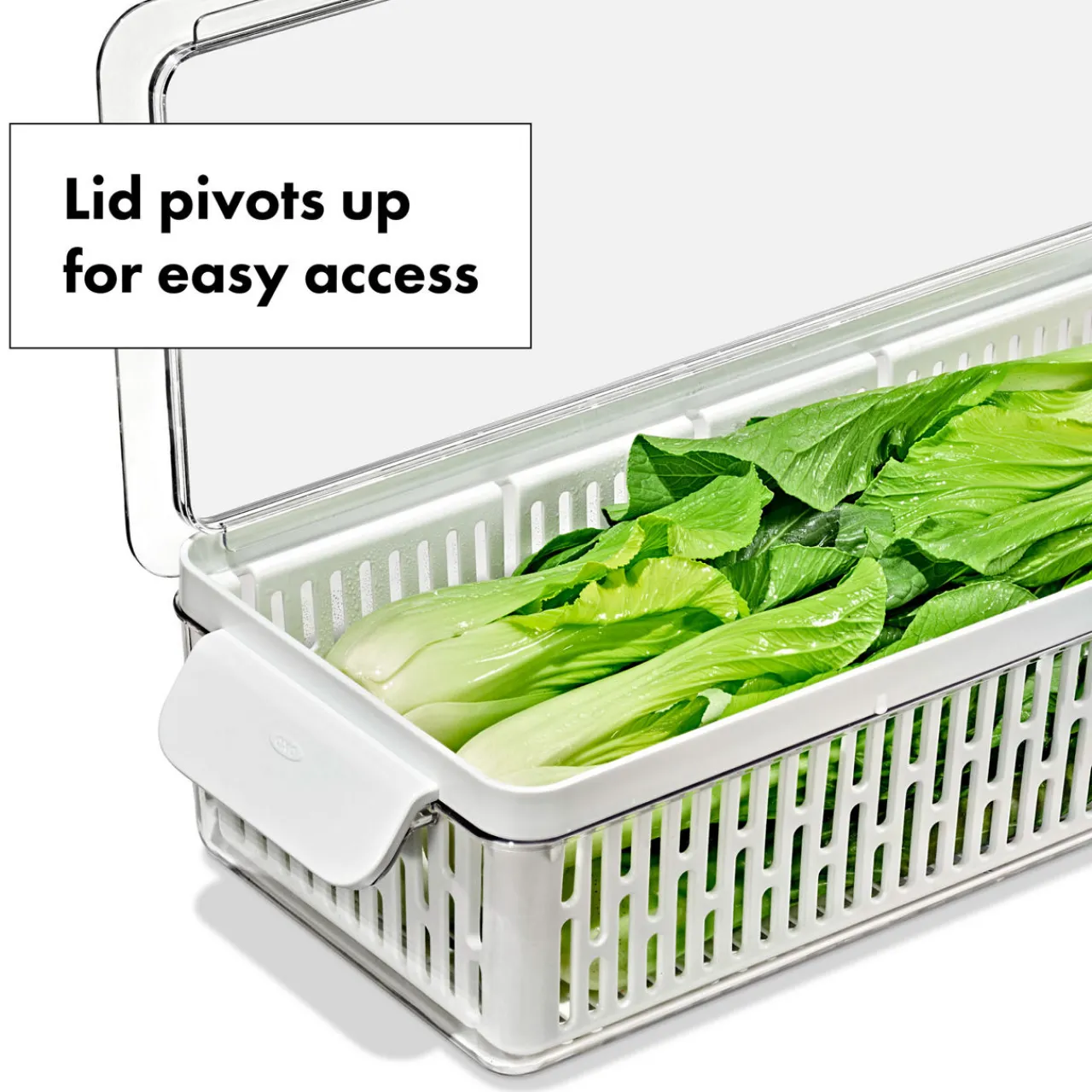- Fridge-friendly fruit and vegetable storage, adjustable divider for organization, removable inner basket for rinsing produce and for air circulation, comfortable handle, pivoting lid, BPA-free