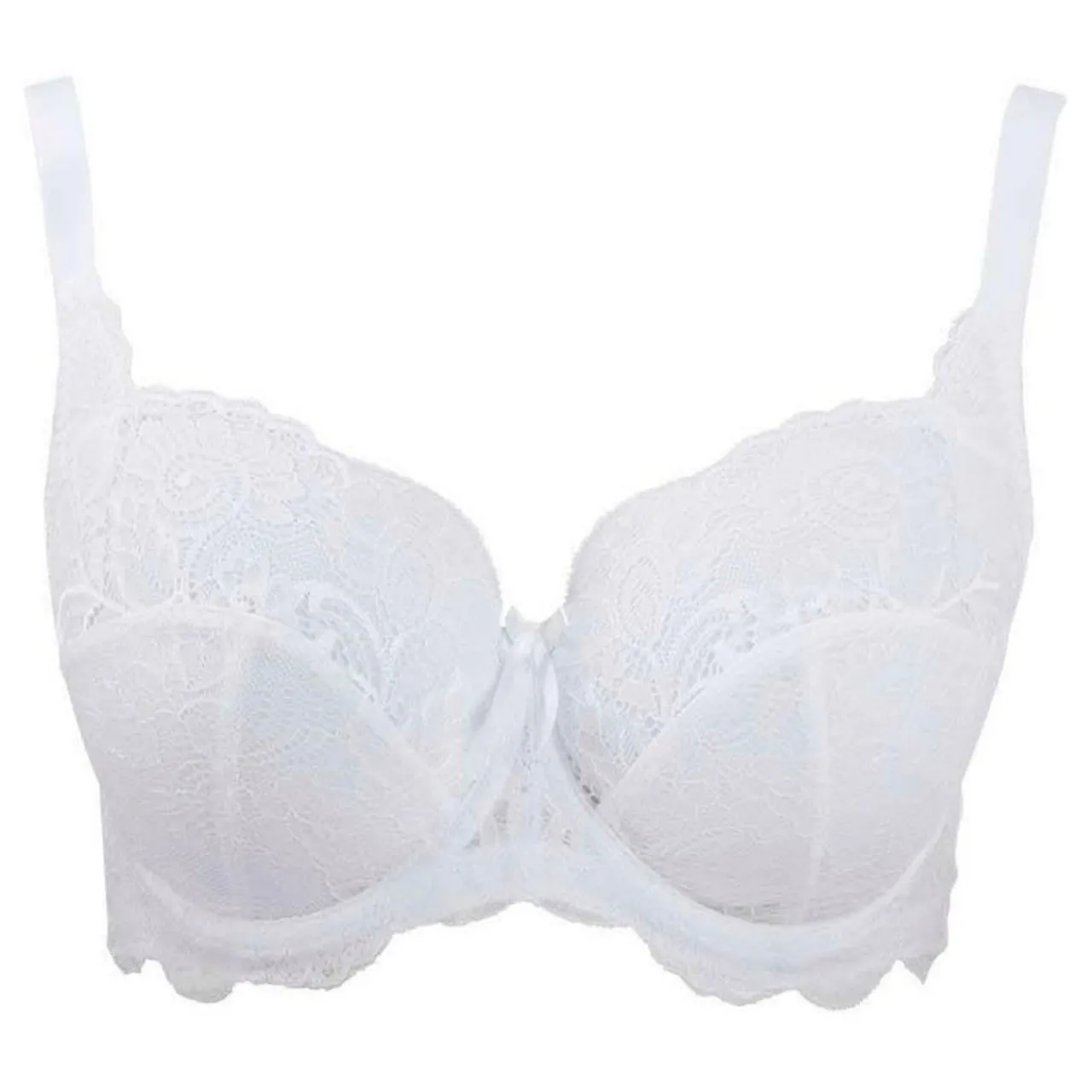- Underwired, adjustable straps, hook and eye fastening, inner cup sling, lace trim, three part cup