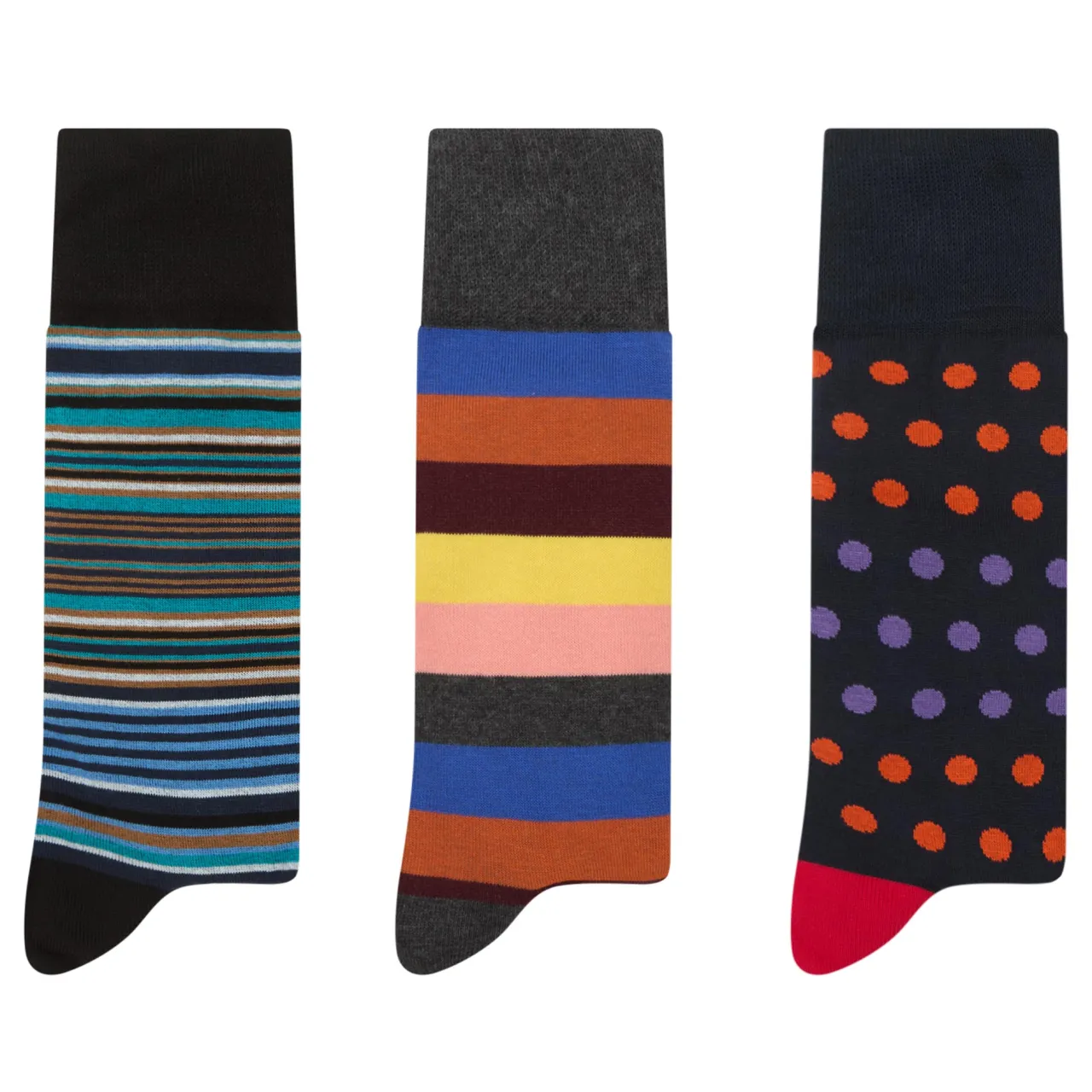 - Pack of three, assorted patterns, crew length, ribbed cuffs, reinforced heel and toe, logo details