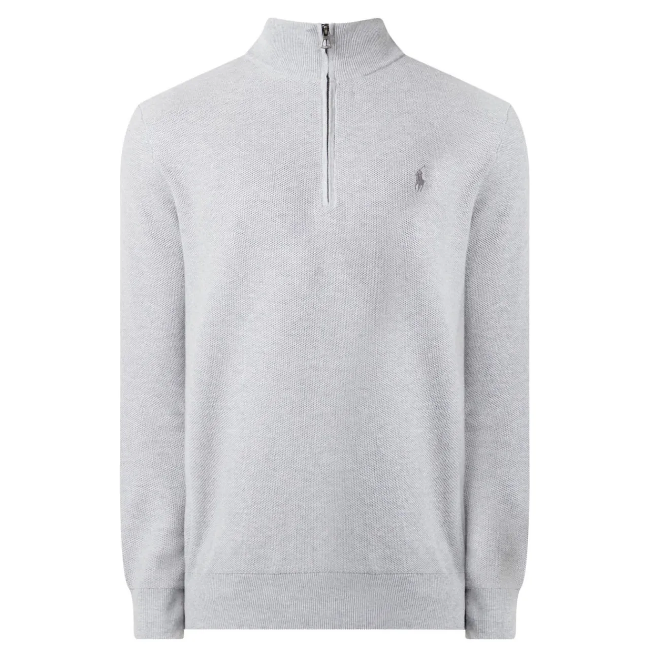 - Rib-knit mock neck, quarter-zip placket, long sleeves, rib-knit finishes, signature logo embroidery on the chest
