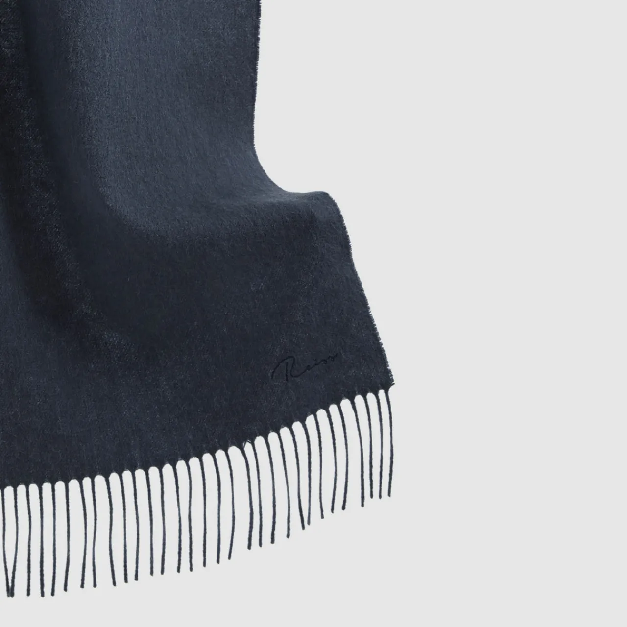 - Wool-cashmere blend, fringed trim, embroidered branding