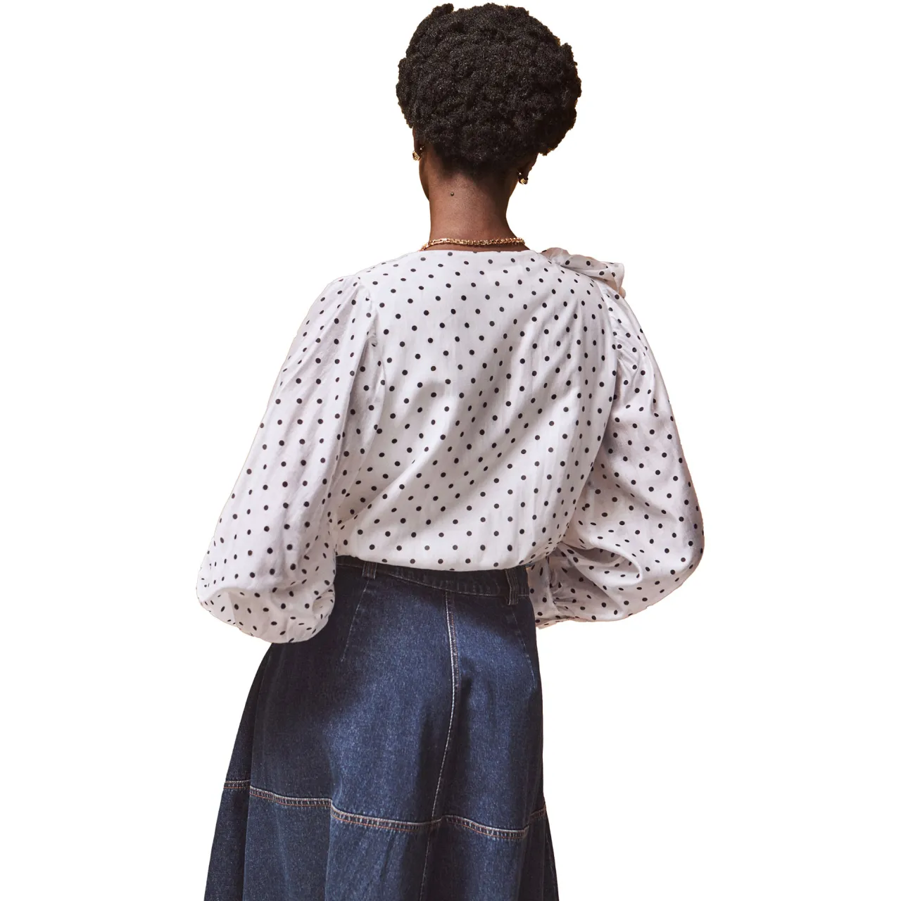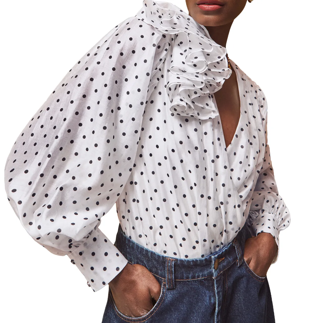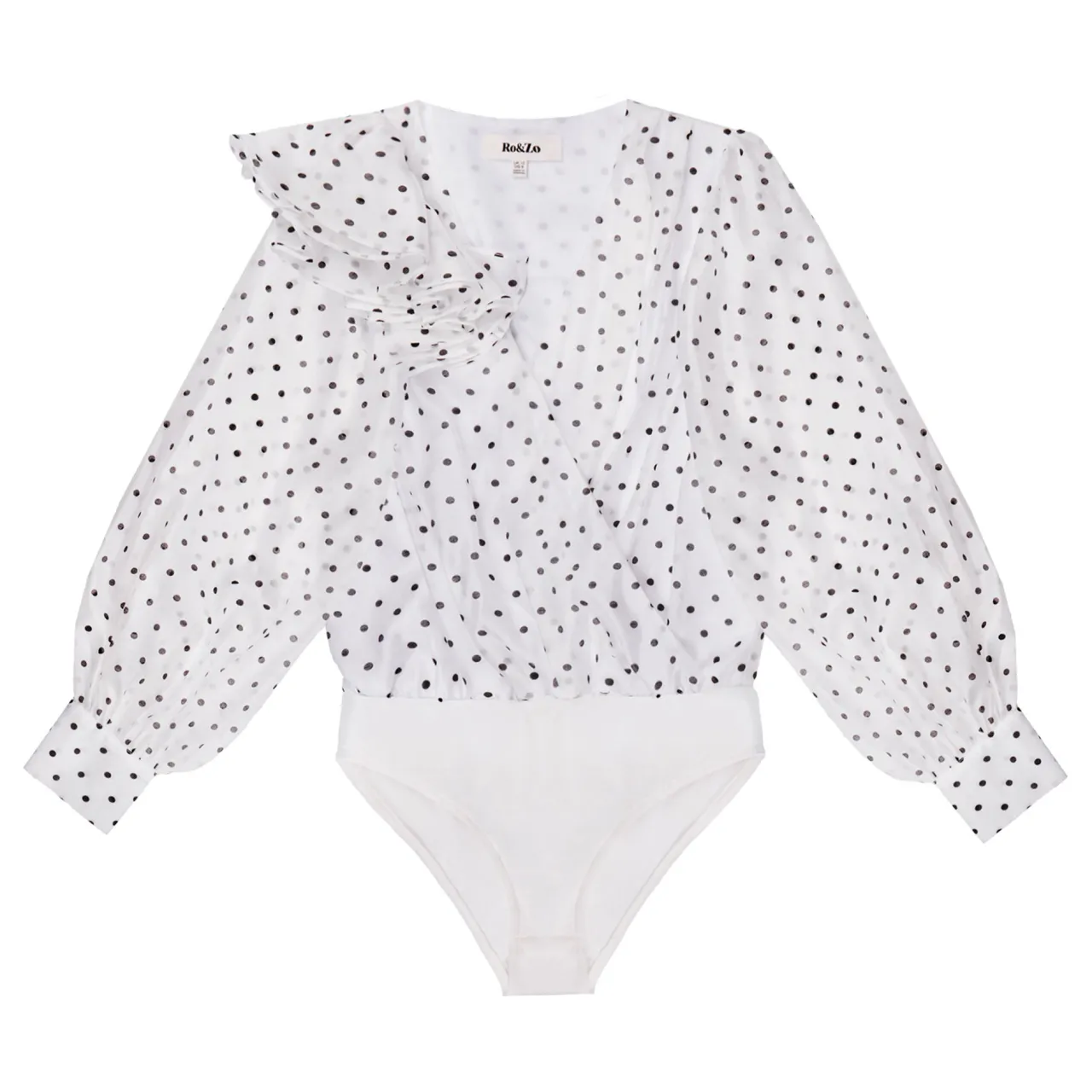 - Mini Spot’ polka dot print, frill detail, woven, long sleeves, V-neckline