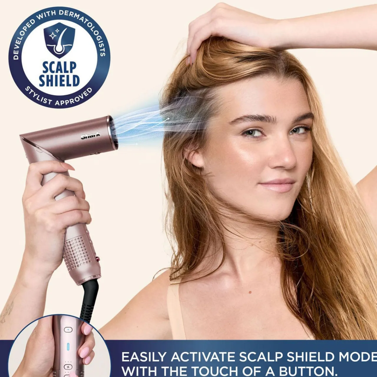 Scalp Shield Mode: Activate to instantly reduce air temperatures to the optimum safe level for scalp comfort and root drying. Designed to protect new hair growth from extreme heat. Developed with dermatologists. Approved by stylists.