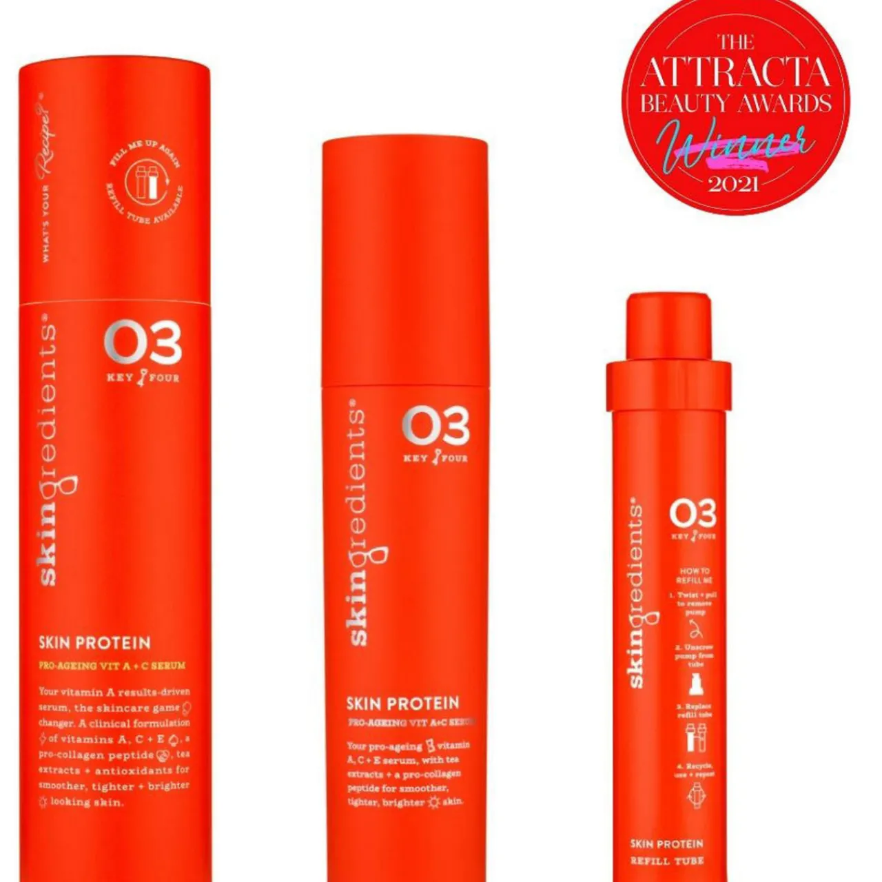 - How to Use: Apply after cleansing in the AM and PM. Apply 1 pump to skin from the nipples up. Smooth into skin and don’t forget to bring it all the way up around eyeballs (but not into them). Our recommendation is to apply a pump of Skin Protein and Skin Veg together to slightly damp skin from the nipples up. Please note: this slot-in refill tube clicks into the original, primary packaging. You must buy the original, refillable Skin Protein Primary Pack first to use your refill tube. How To Refill: After falling in love with 03® (aka the red one) and using every last pump you’ll want to top up. 1.To begin, twist your inner tube out. 2.Twist off the pump – remember to keep your pump close! 3.Take your refill tube, remove the lid and twist the lid back on. 4.Screw the inner tube into the outer tube. 5.Apply our addictive, regenerating serum. 6.Wash, dry + recycle your refill! How To Recycle: This inner tube (refill): is made from polypropylene (aka PP) and polyethylene (aka PE), both of which are widely recyclable plastics. How to recycle your inner tubes: 1.Use every last drop of your Skingredients product. 2.Thoroughly rinse the refillable inner tube. 3.Make sure that the refill is completely dry. 4.Pop in your household recycling bin. 5.Feel happy knowing you’re getting skin results aplenty + doing your bit for the planet.