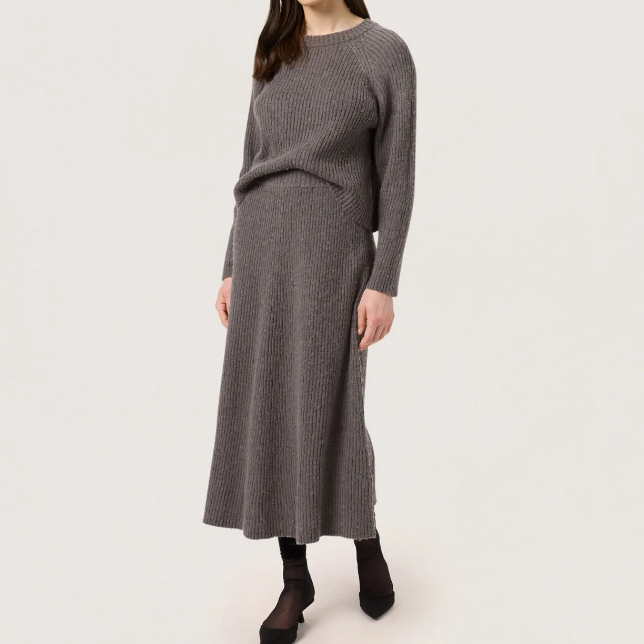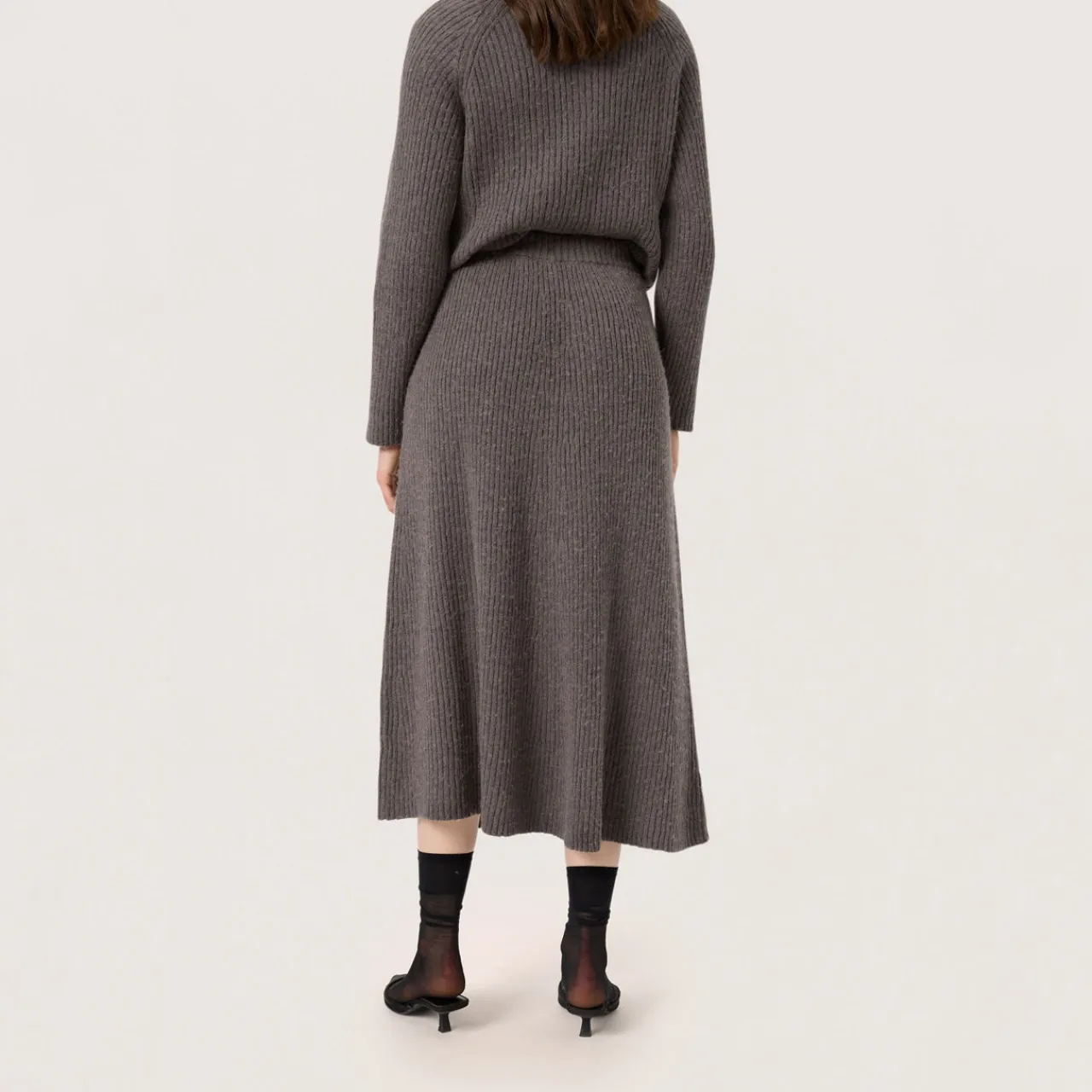 - Ribbed knit, high-waist, A-line shape, midi length, elasticated waistband