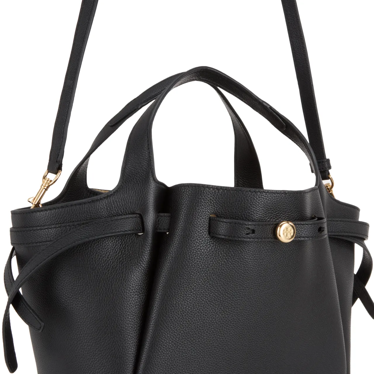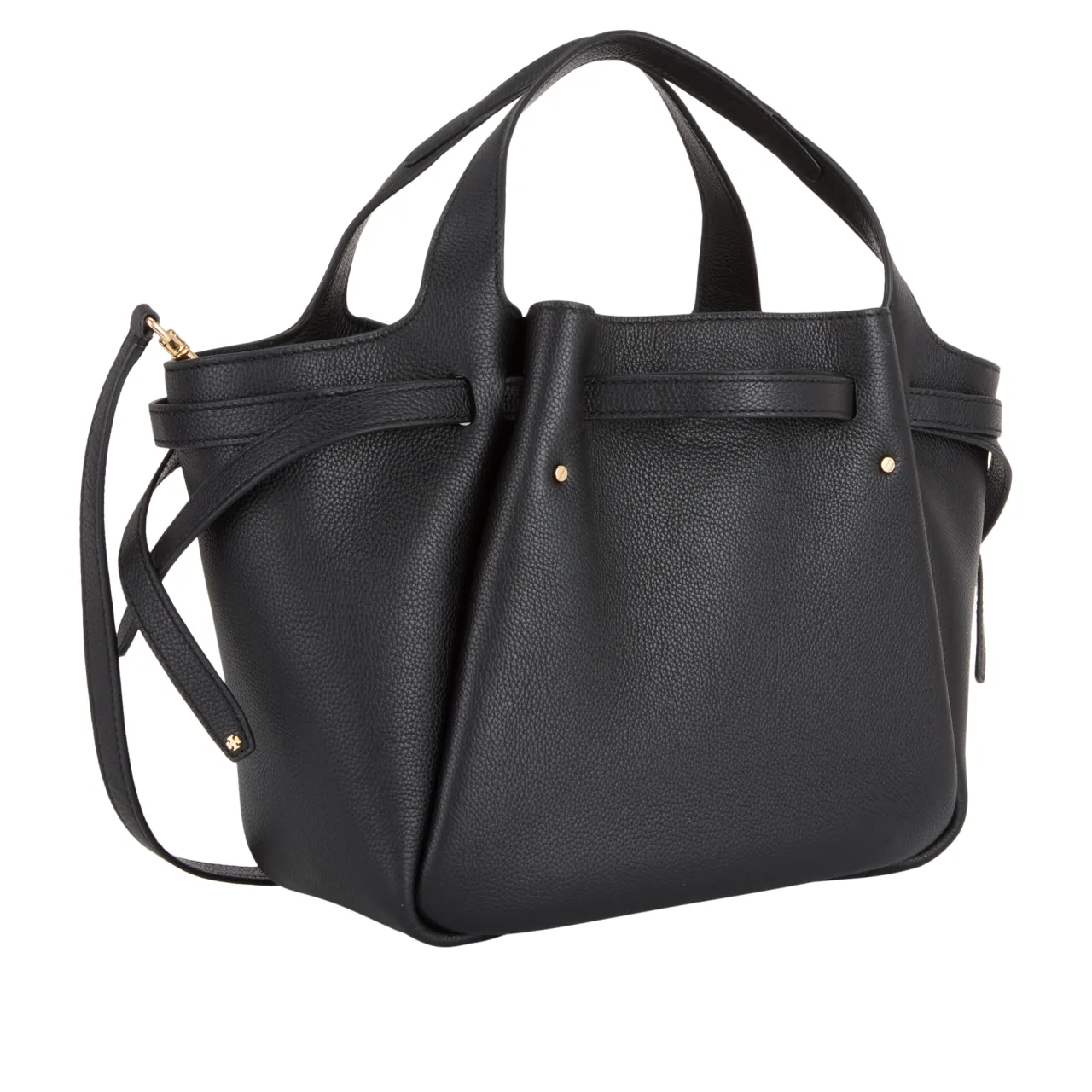 - Top carry handles, detachable crossbody strap, magnetic snap closure, gold-tone hardware, belt with tab adjustable sides, grained finish, logo details