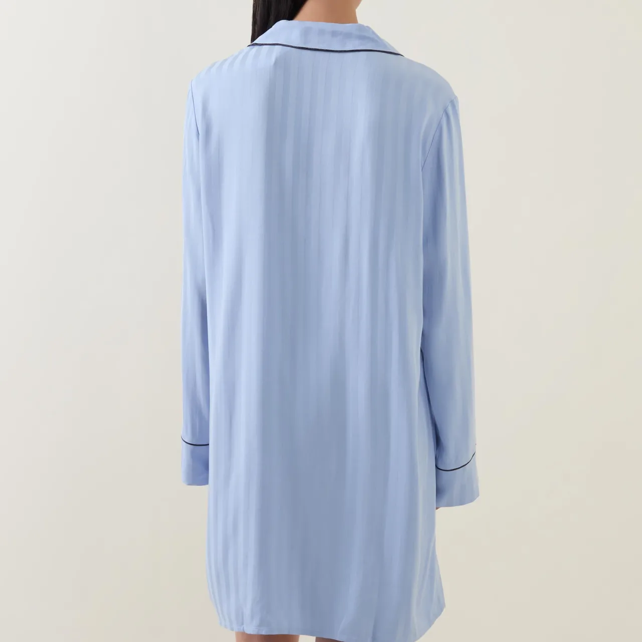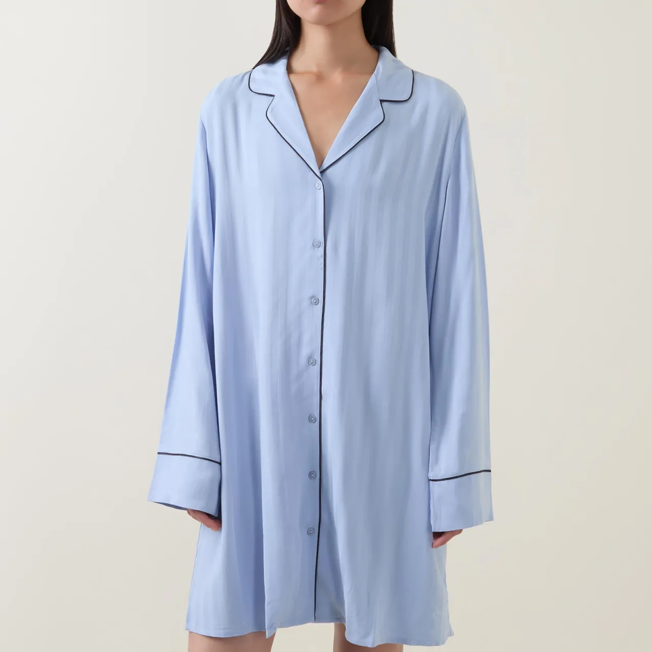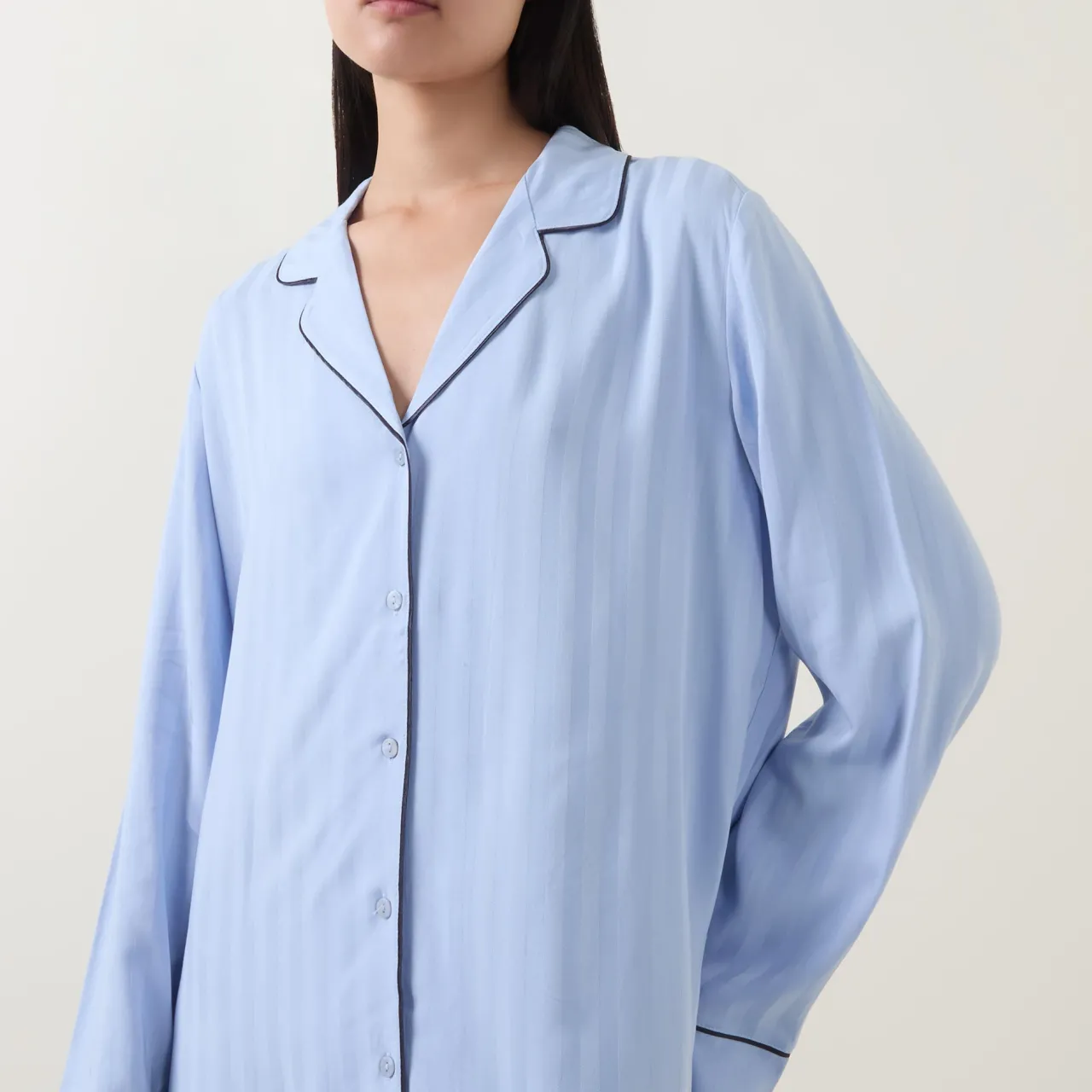 - Notch lapel collar, dropped shoulders, long sleeves, front button fastening, curved hem, contrast trim detailing, jacquard stripe pattern