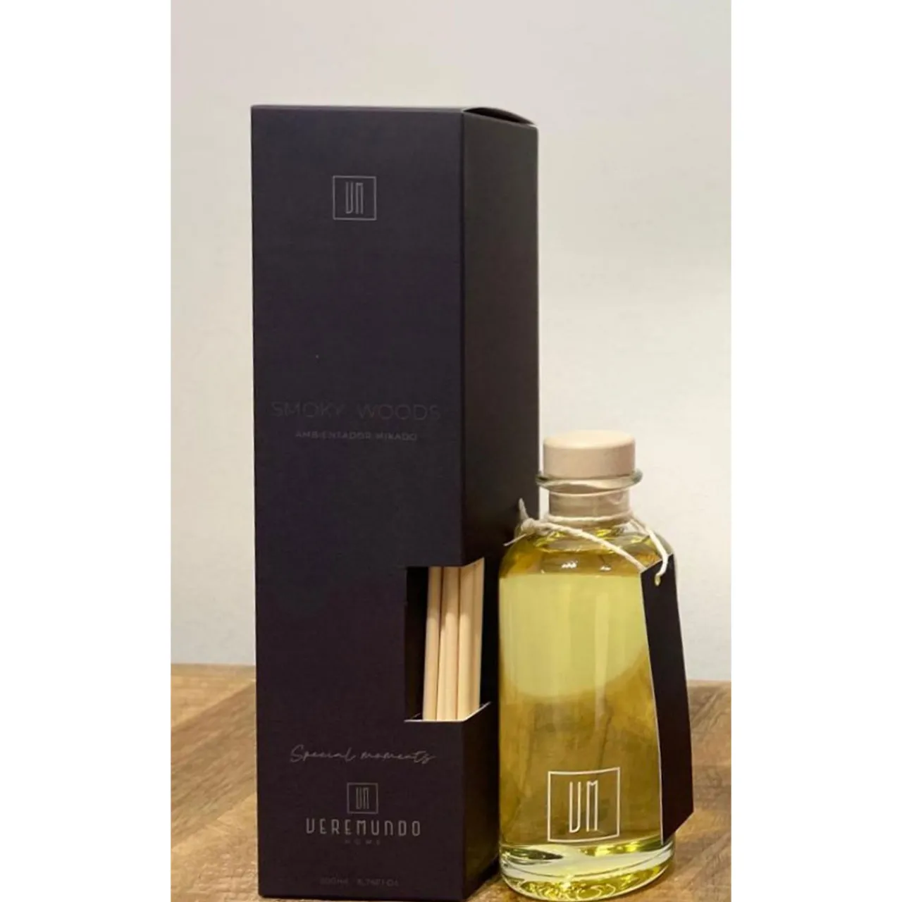 - Mikado air freshener with a clear glass bottle, synthetic beechwood-colored stopper, 6 natural-colored rattan rods, smoky woods scent, includes 6 sticks