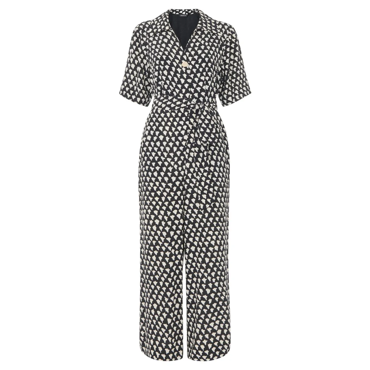 - Collared neckline, large button detail, ankle length, belt detail, short sleeves, abstract triangles pattern