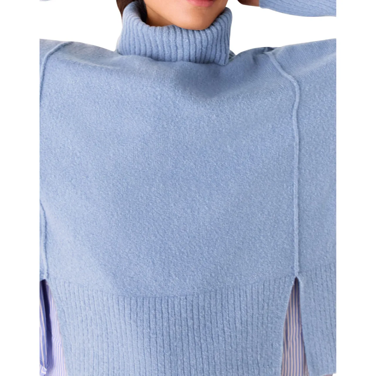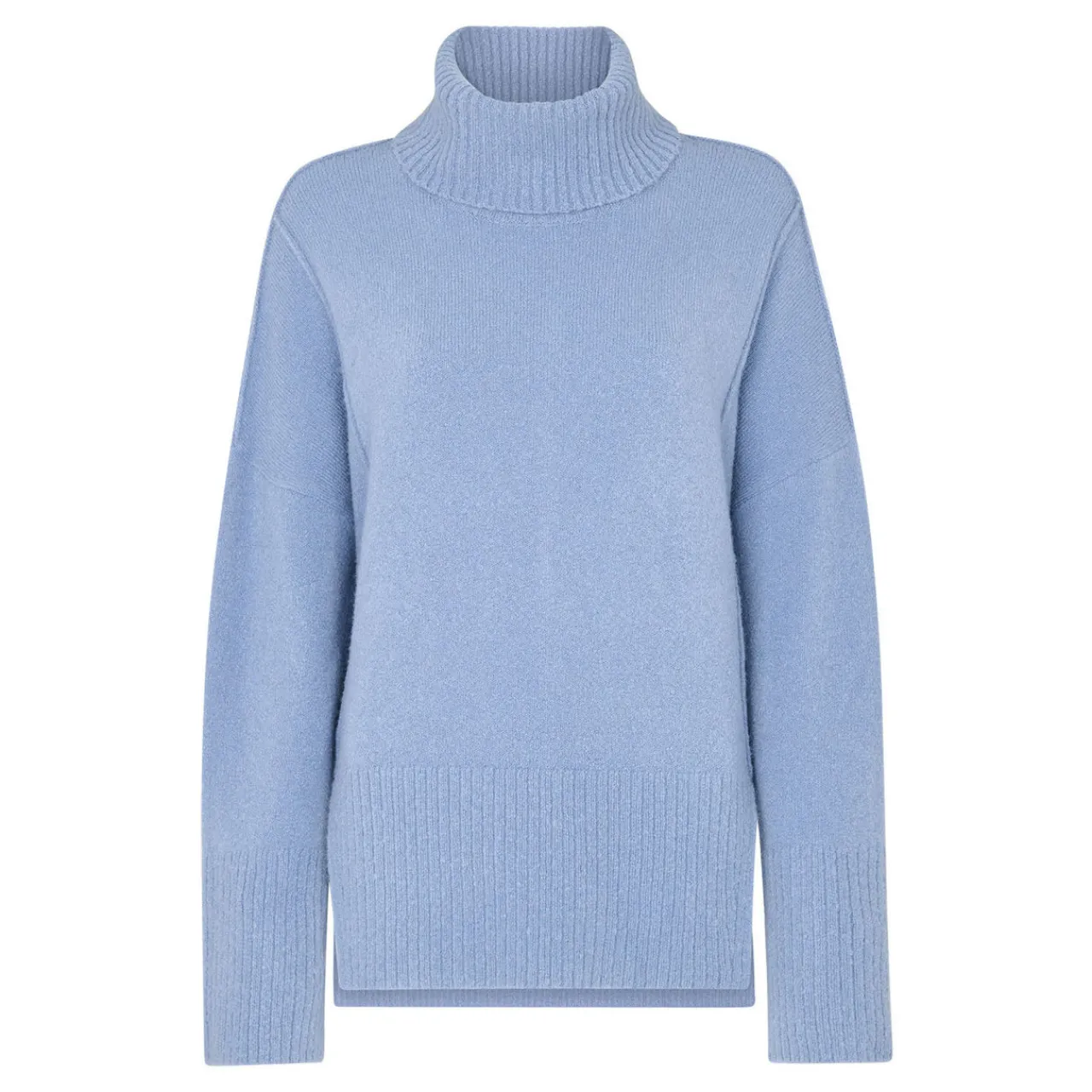 - Roll neckline, long sleeves, raised seams, knit structure, split side seams, ribbed trims
