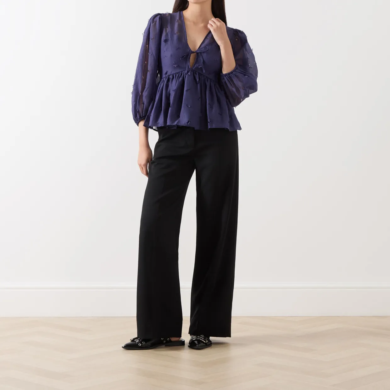 - V-neckline, front tie fastening, three-quarter length puff sleeves, elasticated cuffs, peplum hem, semi-sheer finish with delicate laser-cut floral detailing, slip included