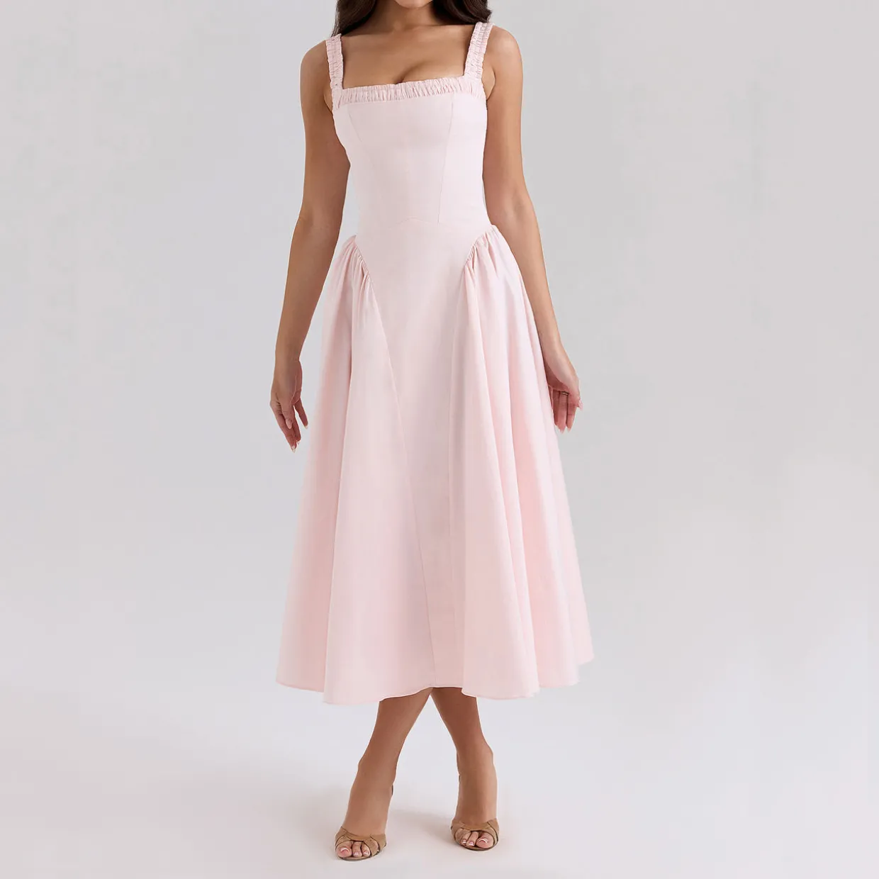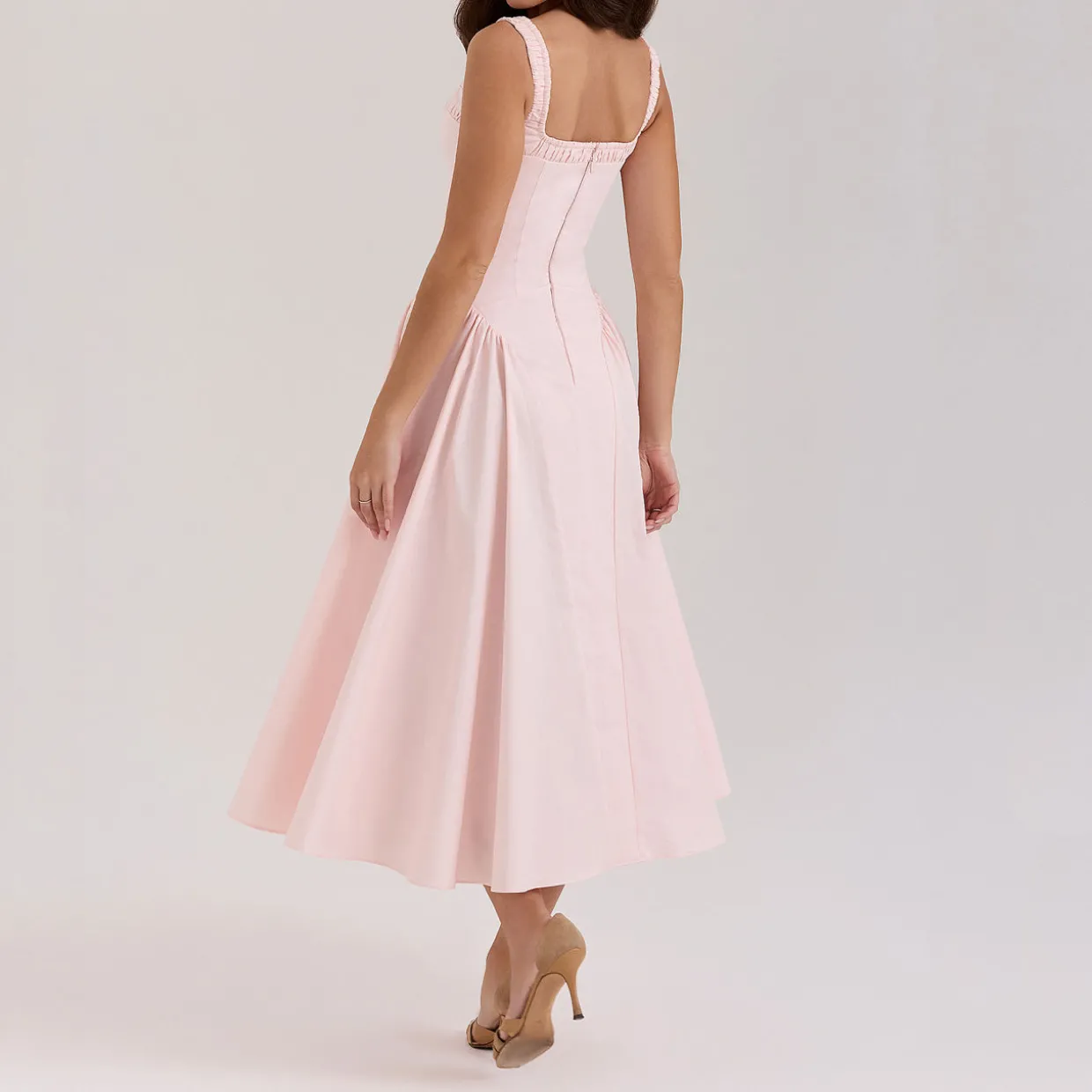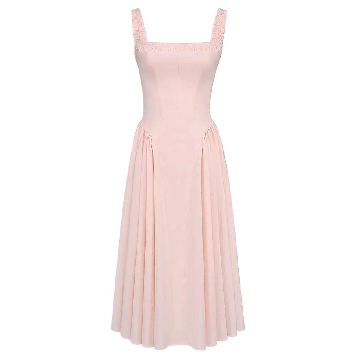 - Stretch-fused fabric, gathered neckline, straps with elastic