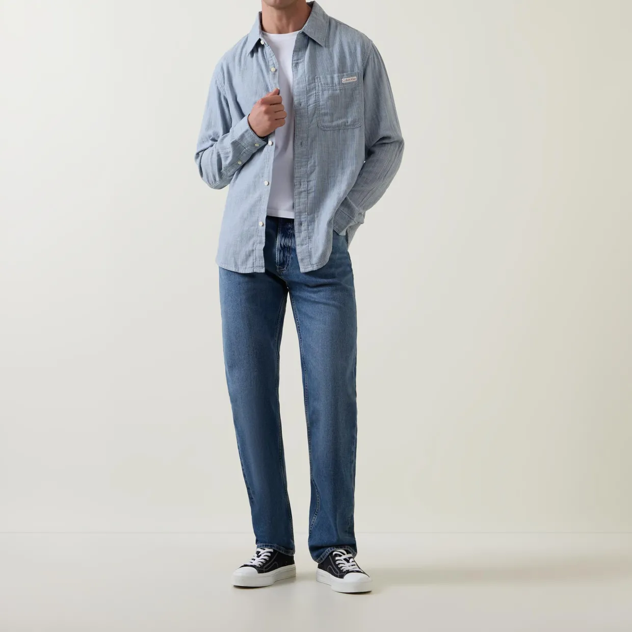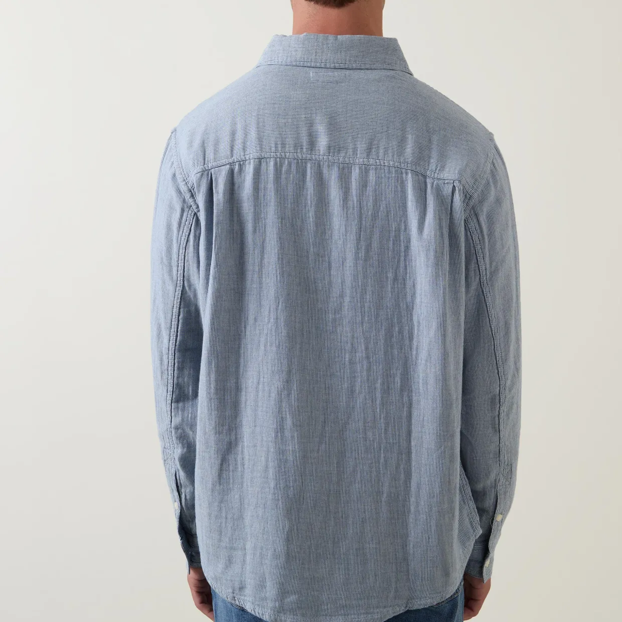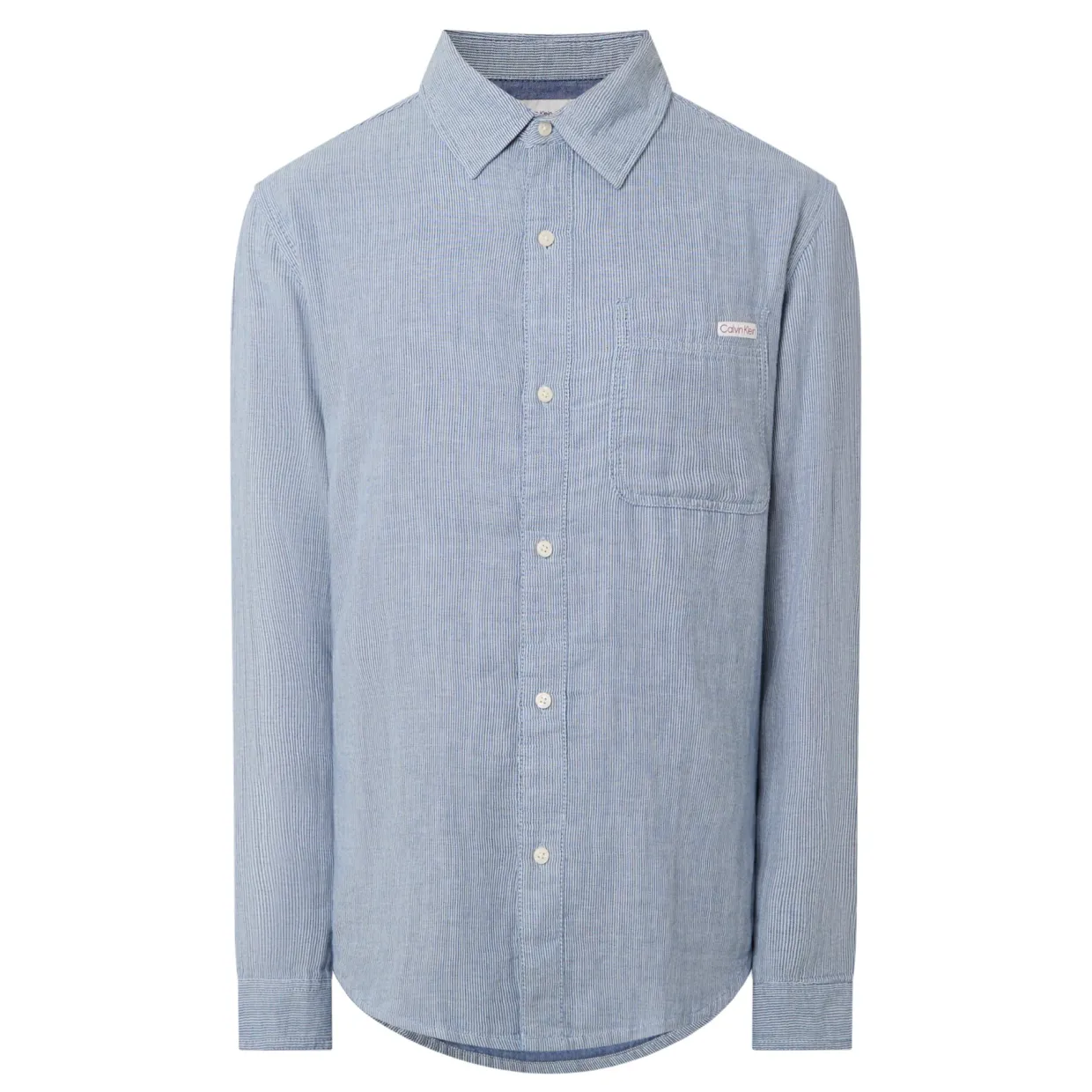 - Point collar, long sleeves, buttoned cuffs, front button fastening, one chest patch pocket, curved hem, logo detail, double-faced design, striped pattern