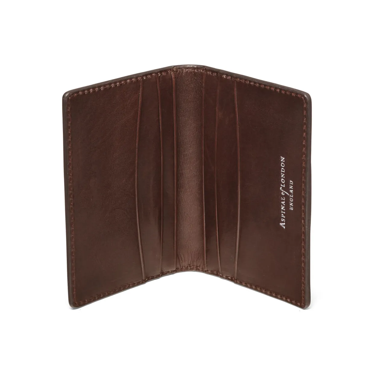 - Fold-over design, six card slots, lined, woven leather texture, lined, slimline, logo lettering