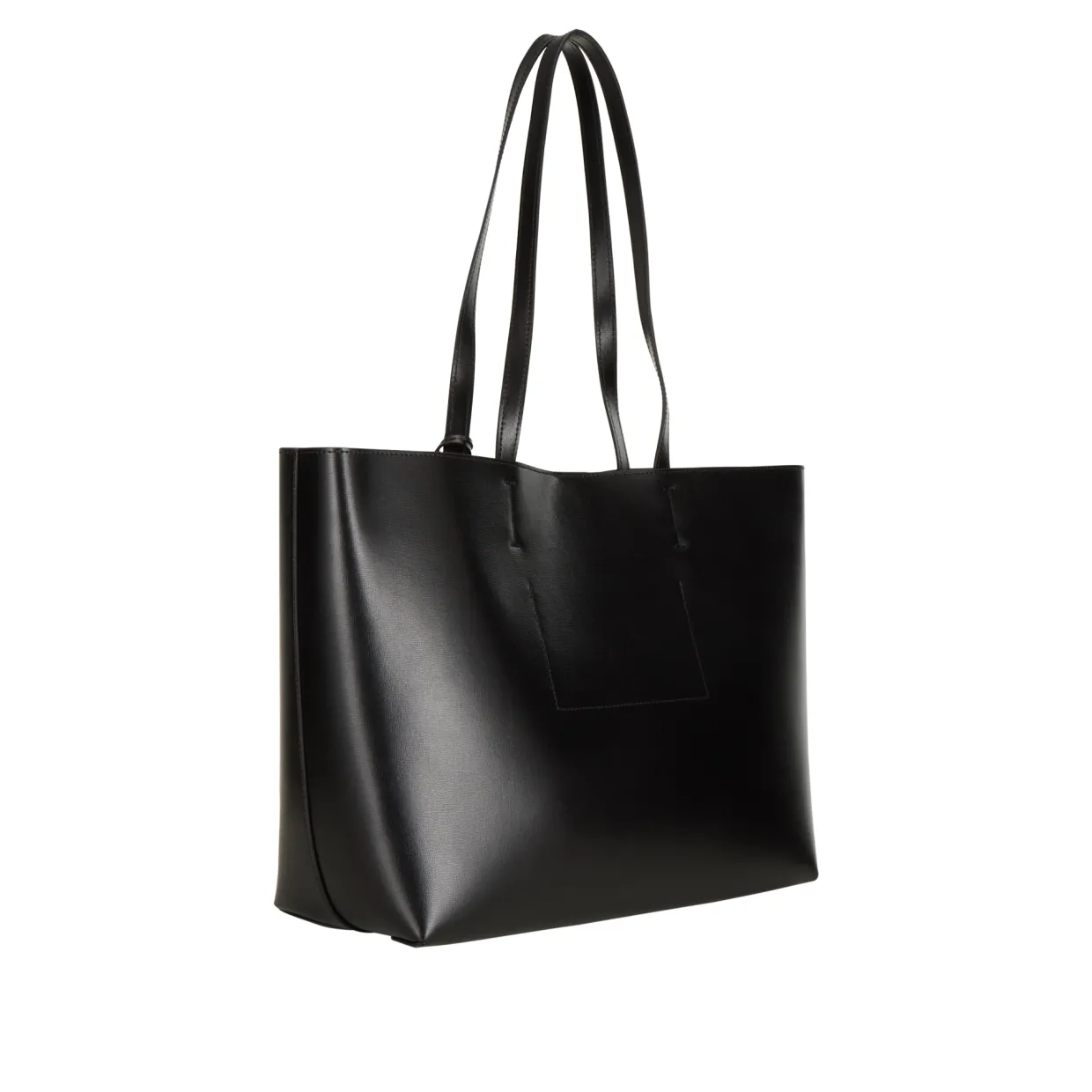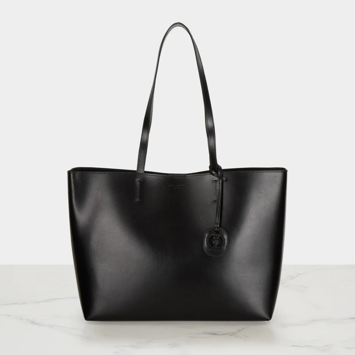 - Top carry handles, open-top with magnetic button closure, keyring with eagle head embellishment, grained finish, logo details
