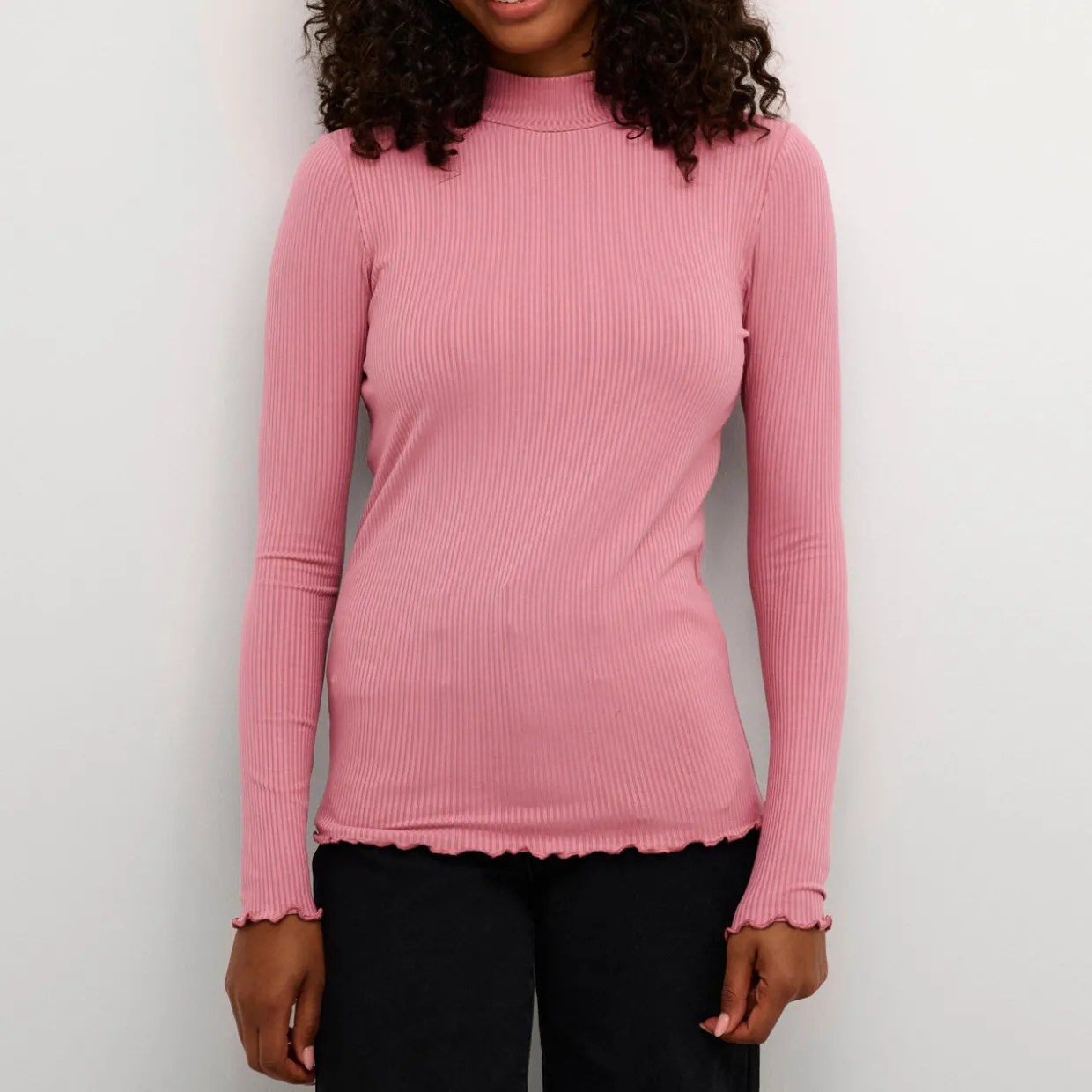 - Turtleneck, long sleeves, roll seam on cuffs and hemline, pull-over style, ribbed-knit finish