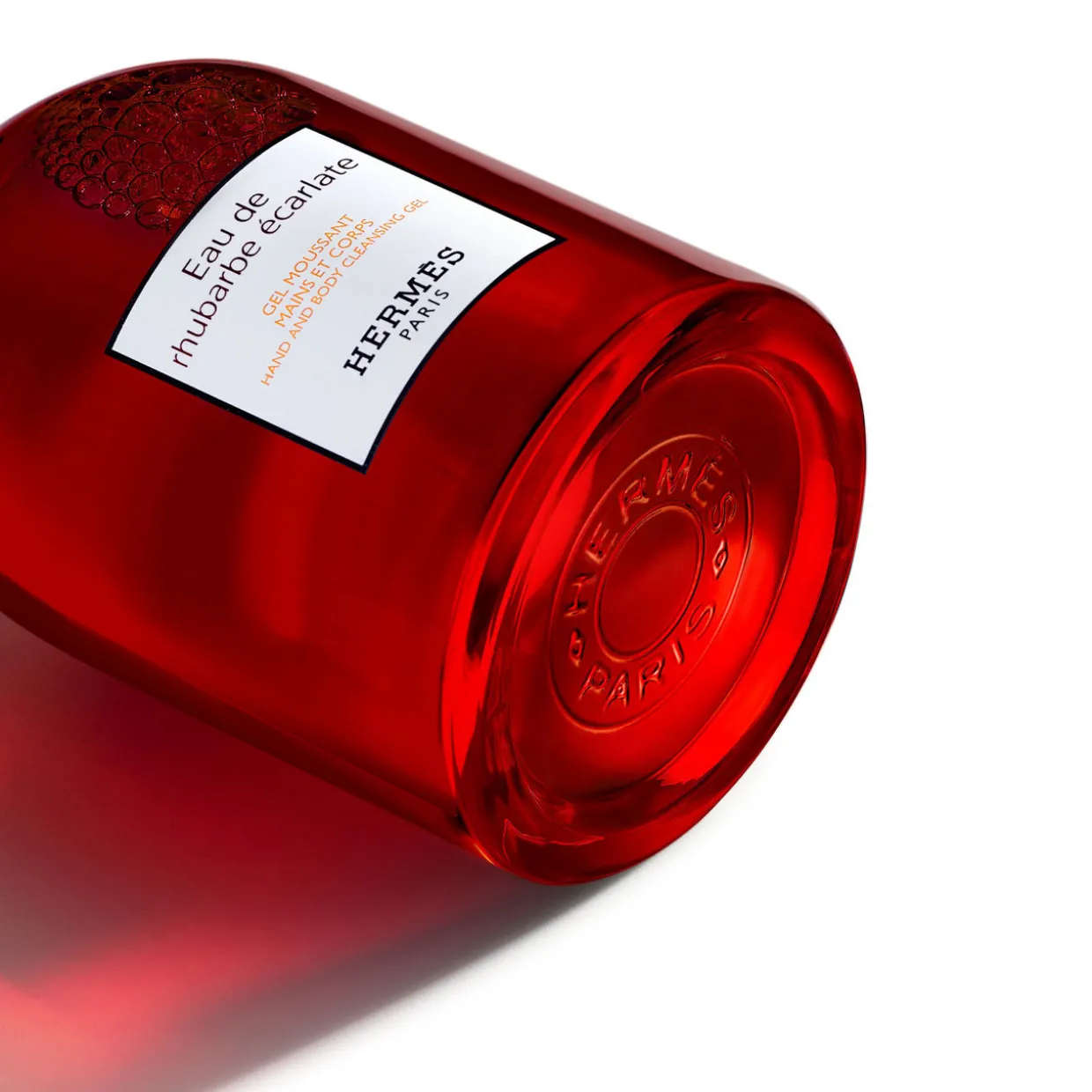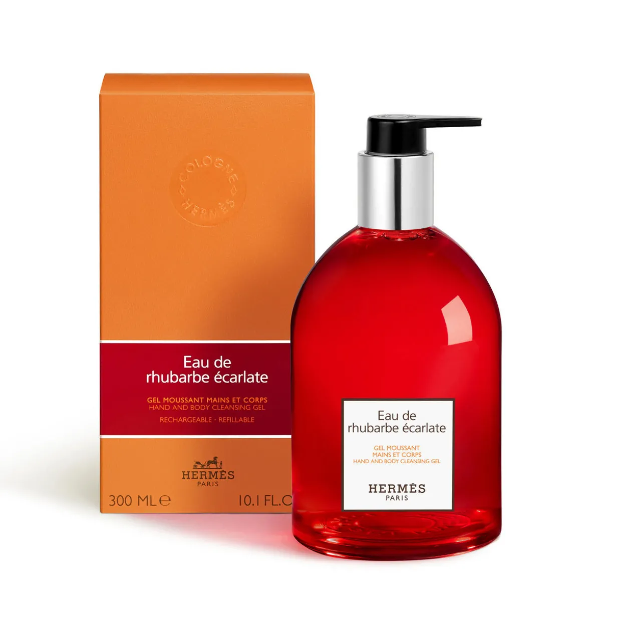 The straight lines of the bottle are embellished with scarlet, emblematic of Eau de rhubarbe ecarlate, and two signature details: the H imprint of the base and the Clou de Selle engraved on the pump.