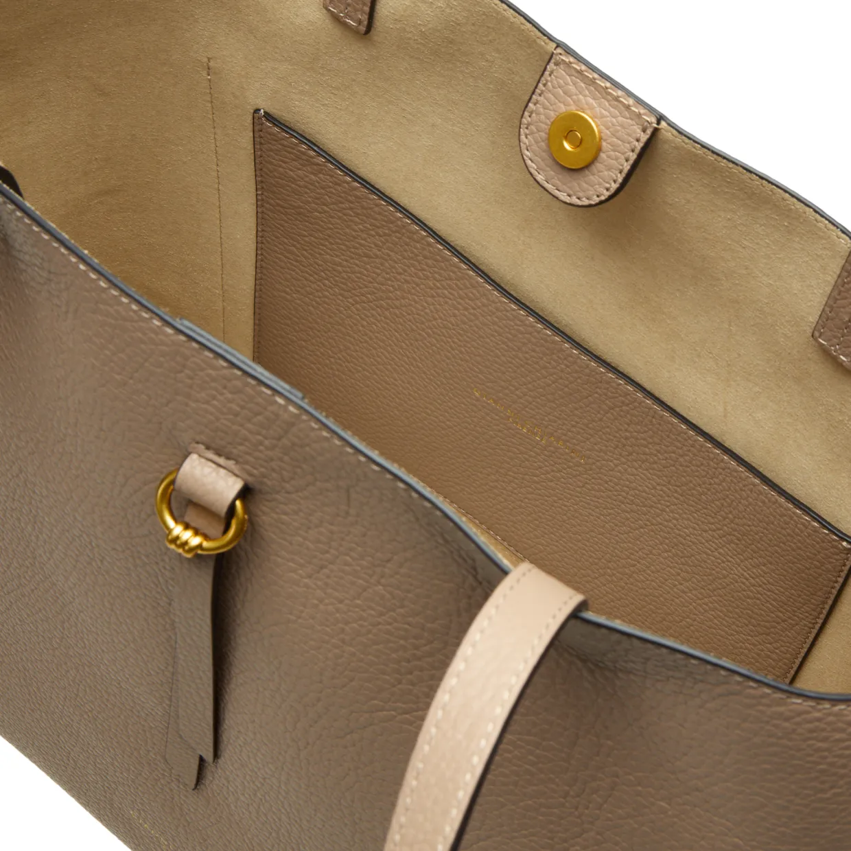 - Top handles, open top, logo detail, magnetic closure, gold-toned hardware, internal slip pocket, back slip pocket