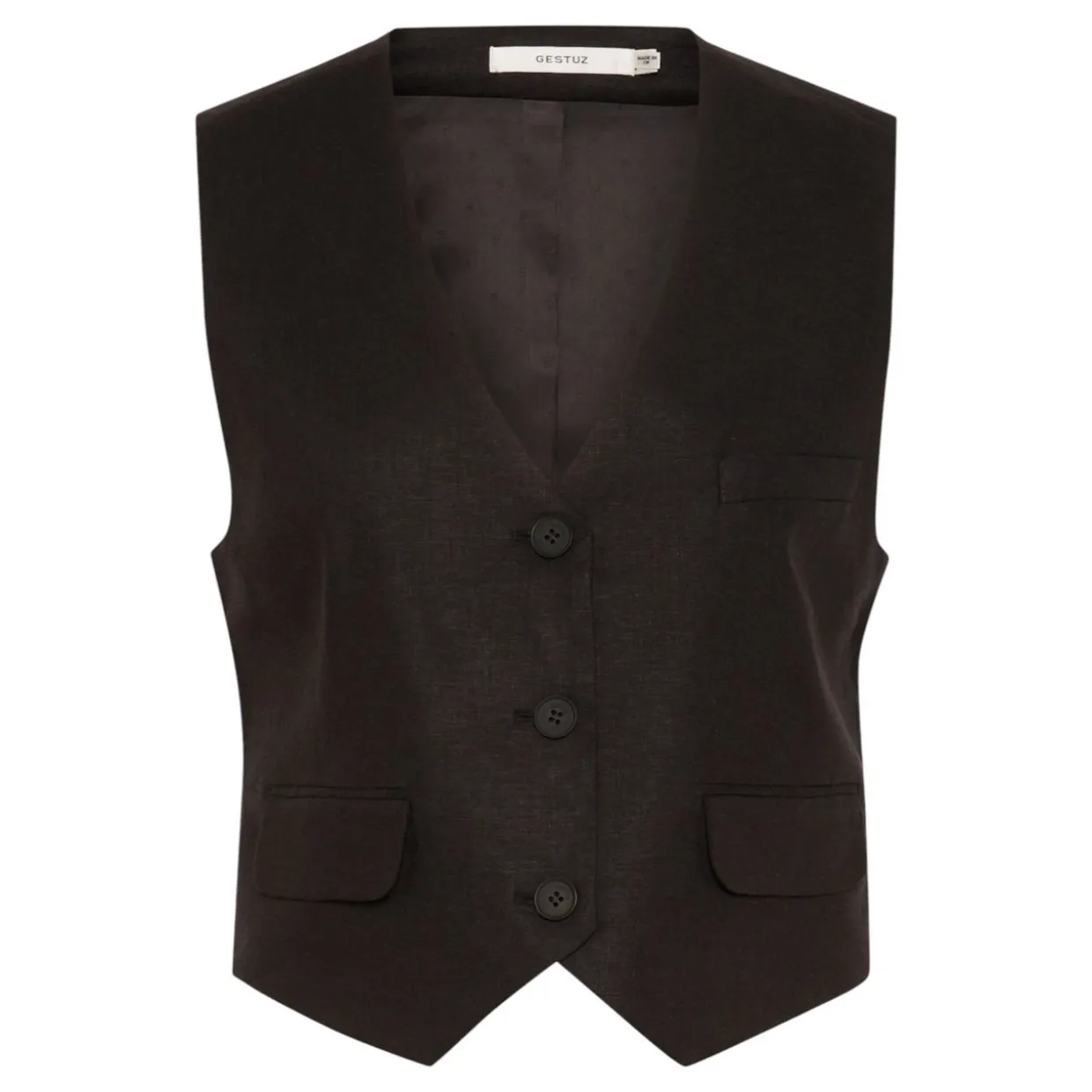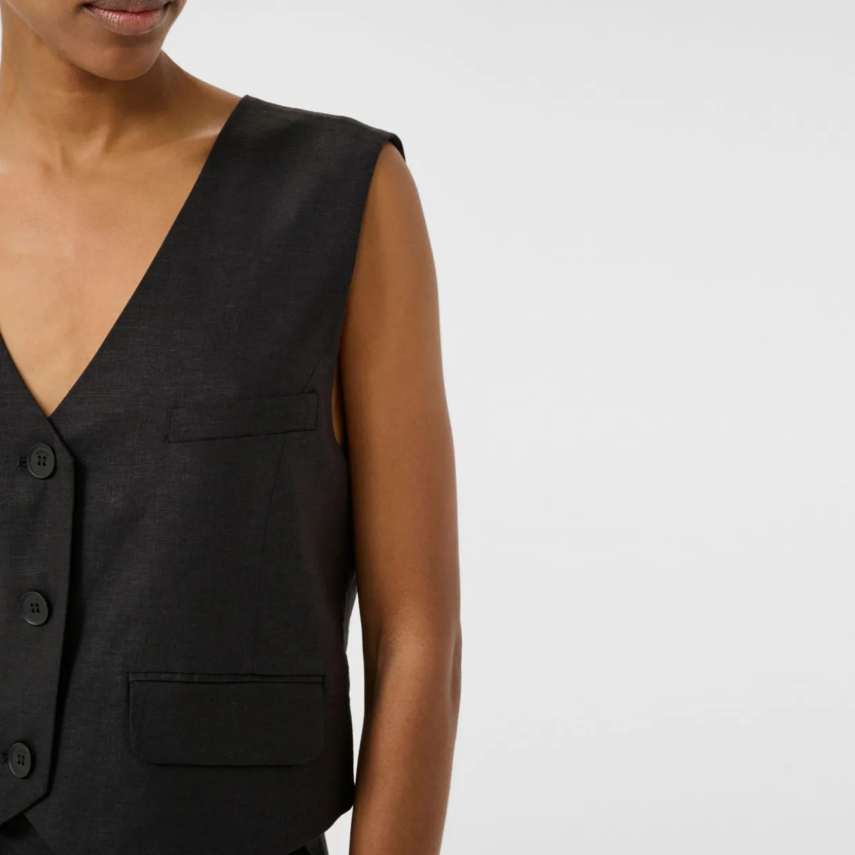 - V-neckline, button fastenings, pointed edges, flap front pockets, sleeveless