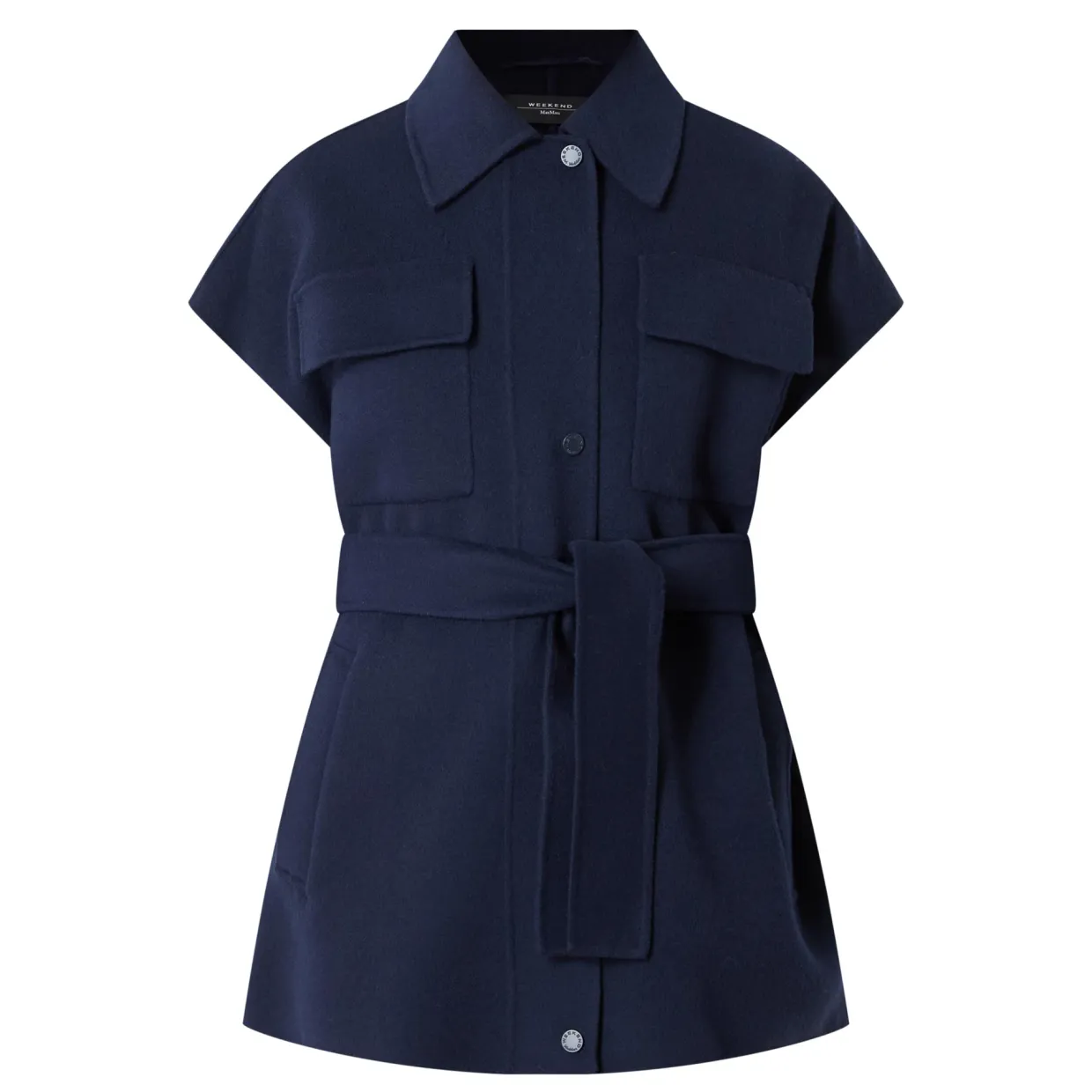- Short cap sleeves, point collar, front button placket, two chest flap pockets, two side in-seam pockets, self-fabric tie-fastening belt, curved hemline, smooth fabric