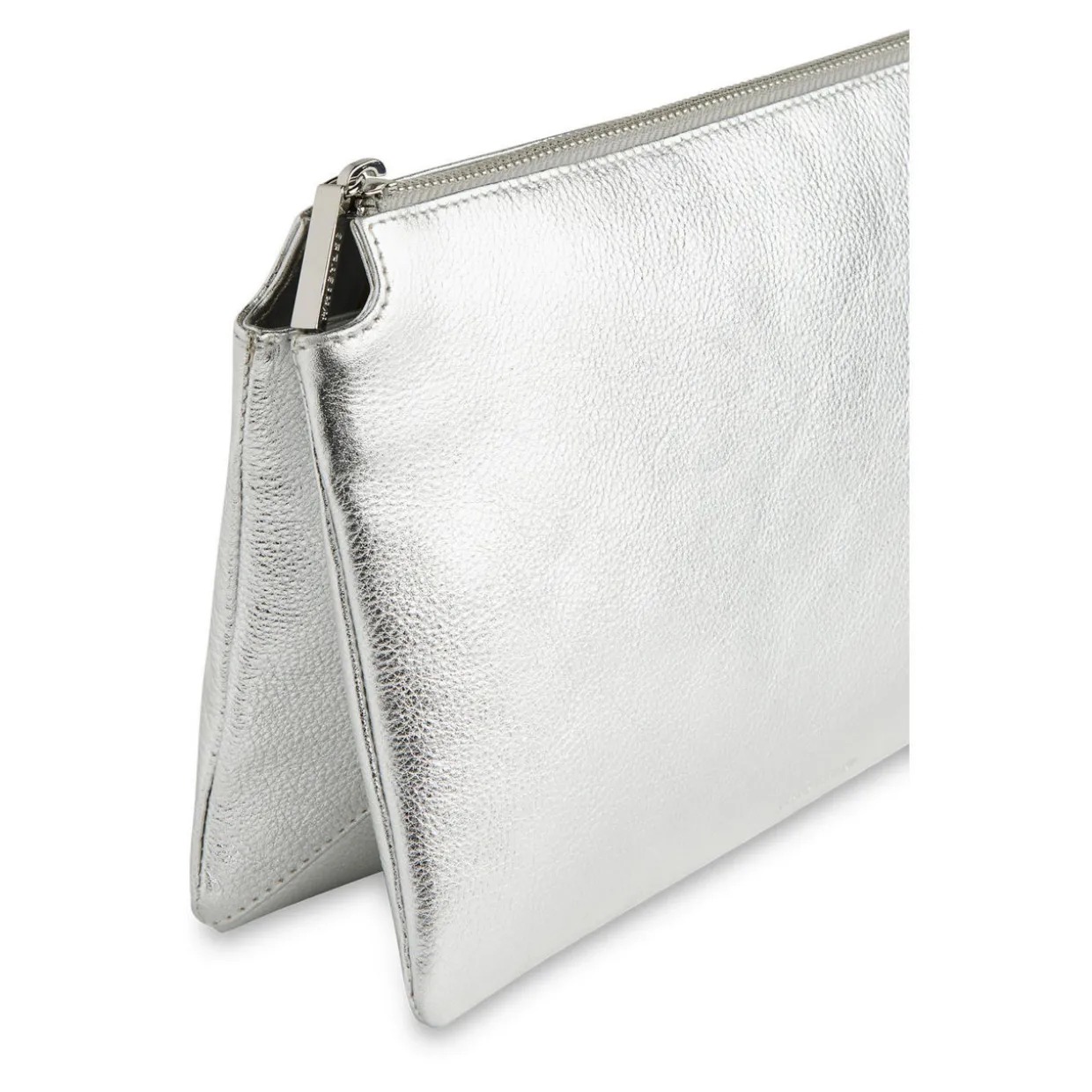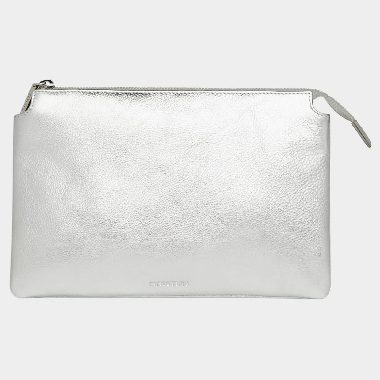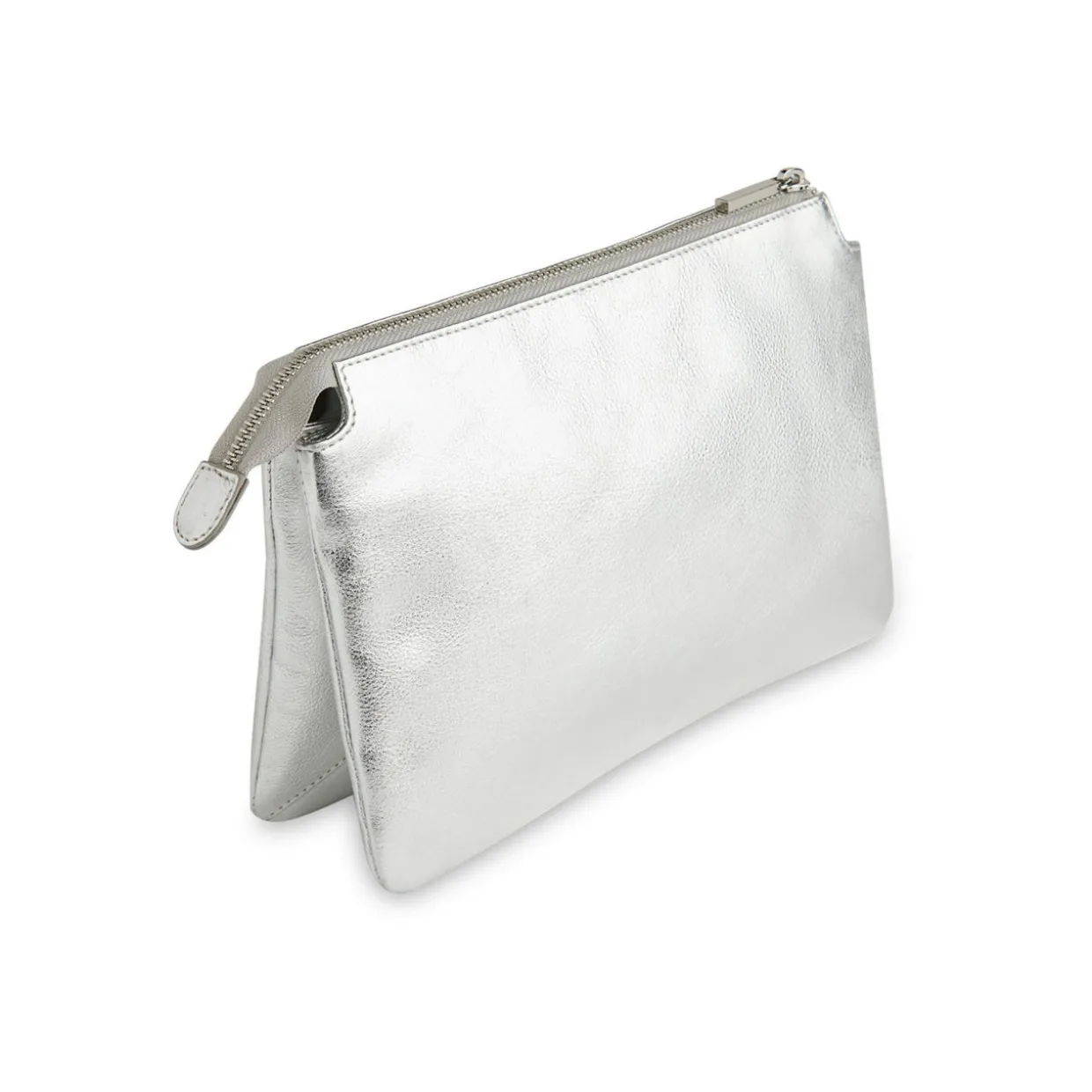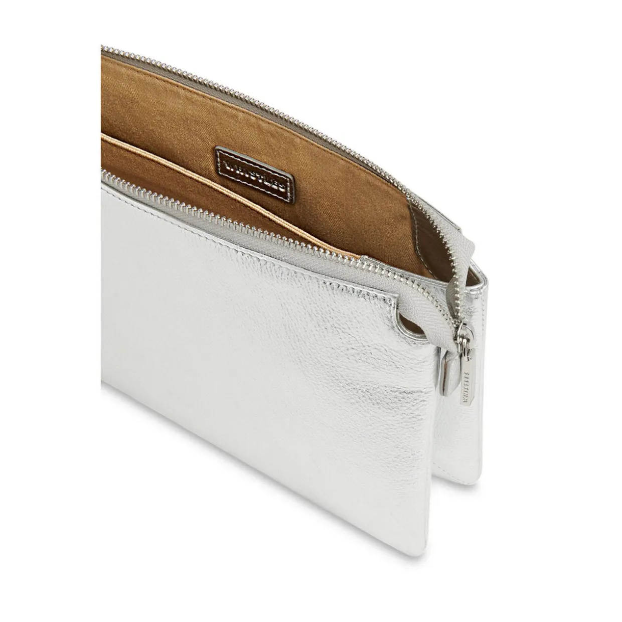 - Double pouch, silver hardware, zip fastening, front branding