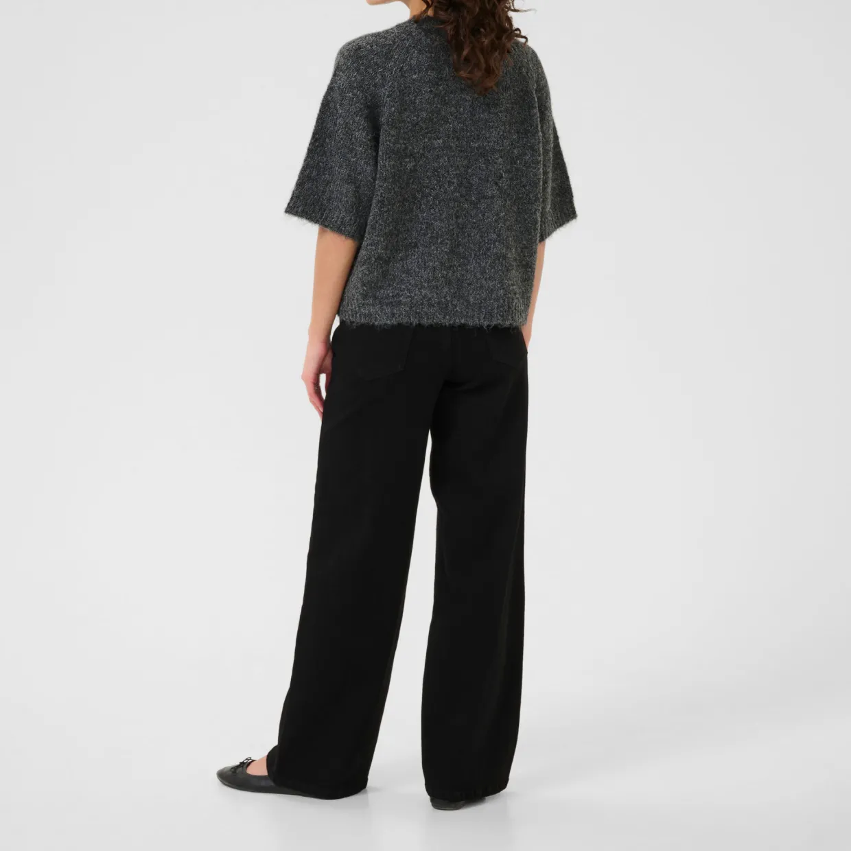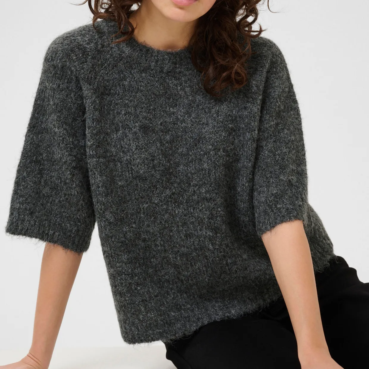 - Knitted, three-quarter-length sleeves, crew neckline