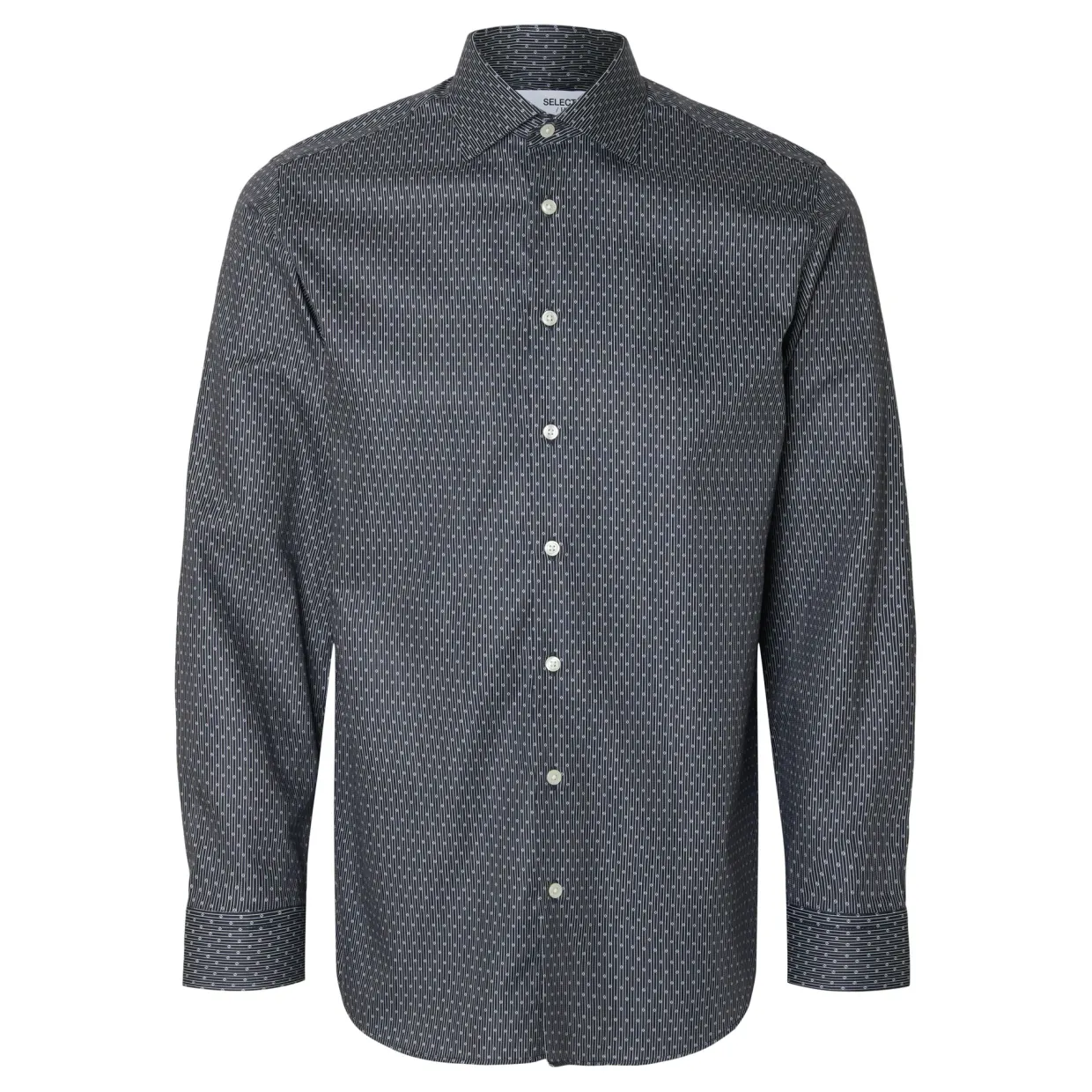 - Buttoned cuffs, shirt collar, long sleeves, button fastening, curved hem, treatment for a soft feel, printed