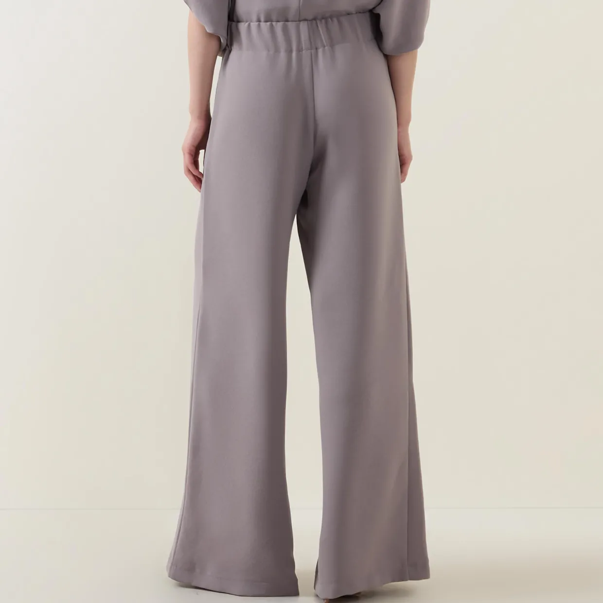 - High-rise, wide leg, full length, elasticated waistband, two side seam pockets, clean hems, smooth finish