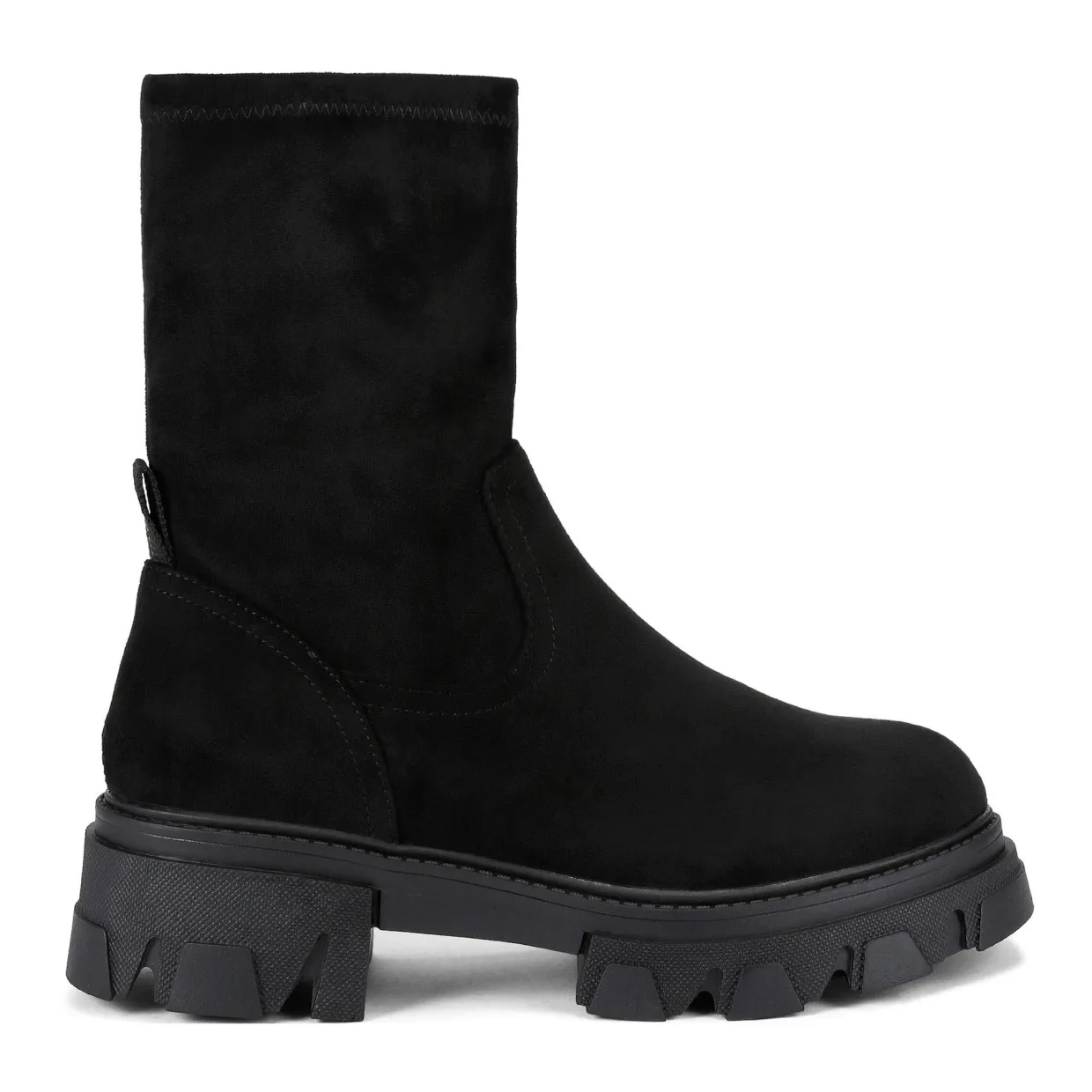 - Sock boot silhouette, microsuede upper, soft ankle, branded heel pull tab, chunky tread sole
