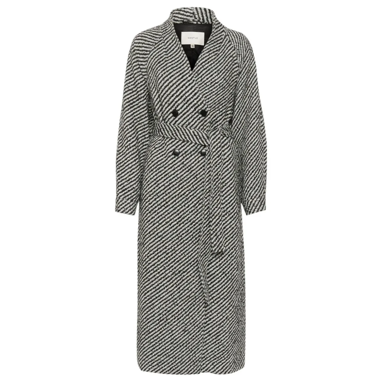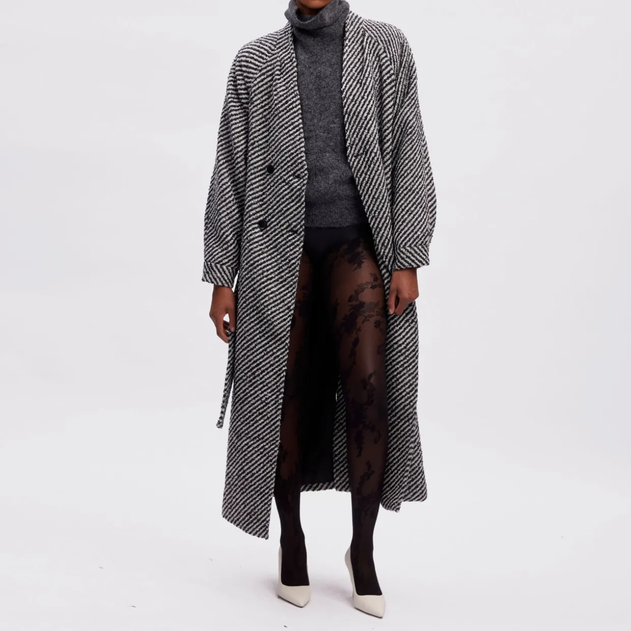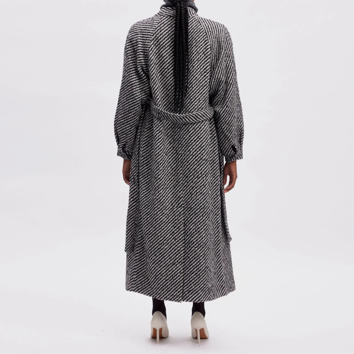 - Shawl collar, double-breasted, button fastening, self-tie belt, side entry pockets, long raglan-style sleeves, striped pattern