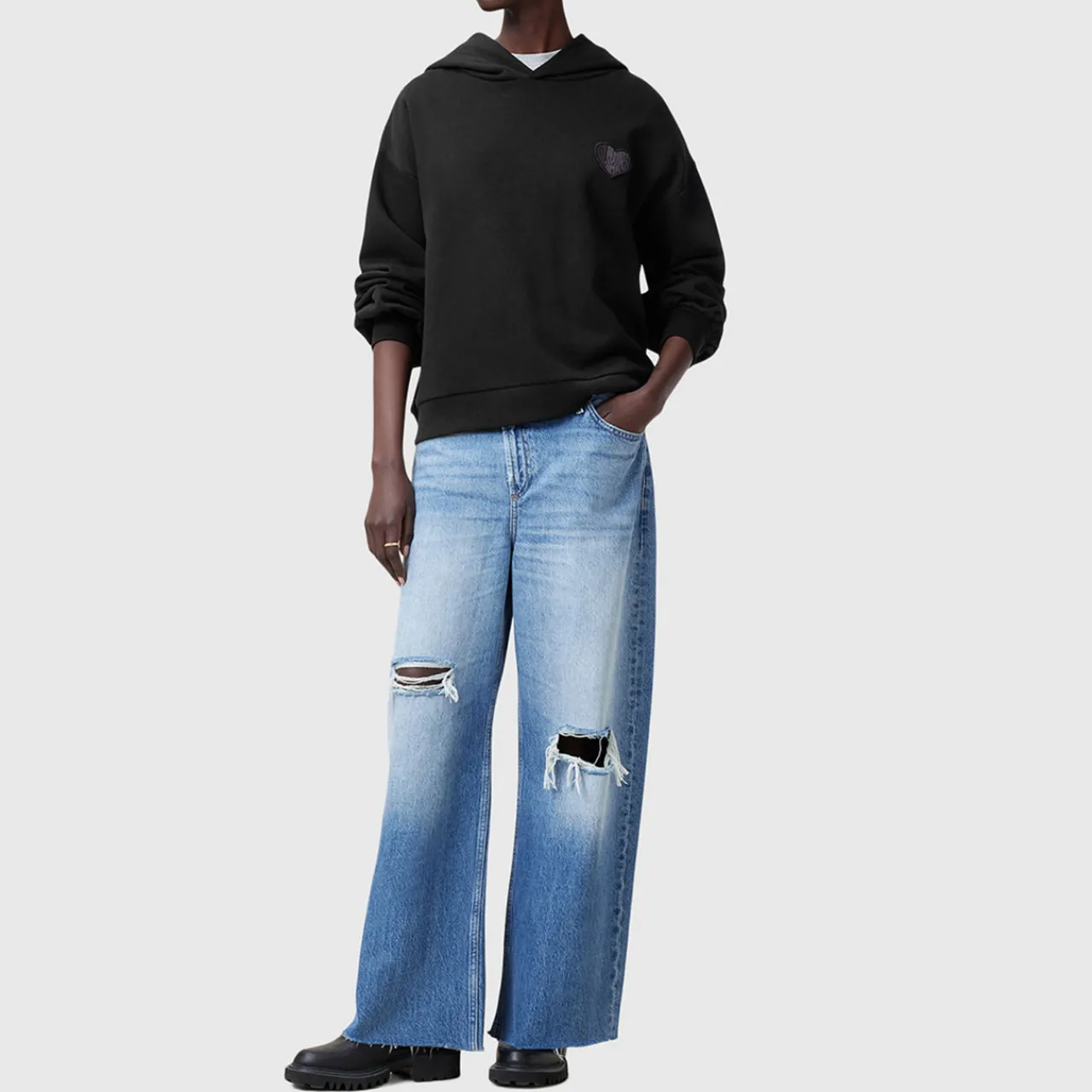 - Hood, dropped shoulders, long sleeves, straight hem, ribbed trims, embroidered heart patch on the chest, rear logo graphic