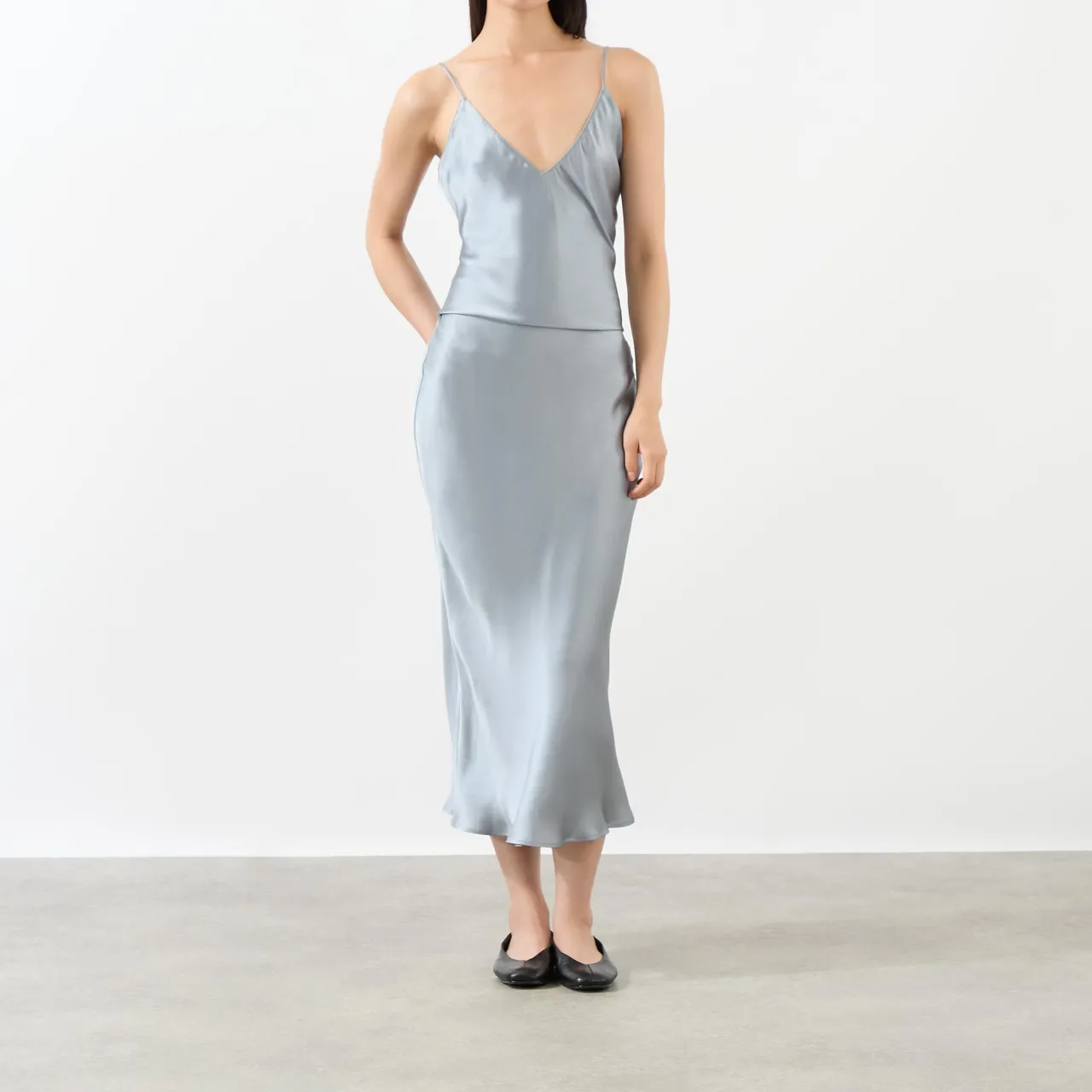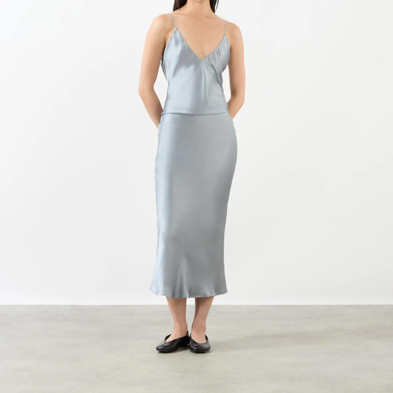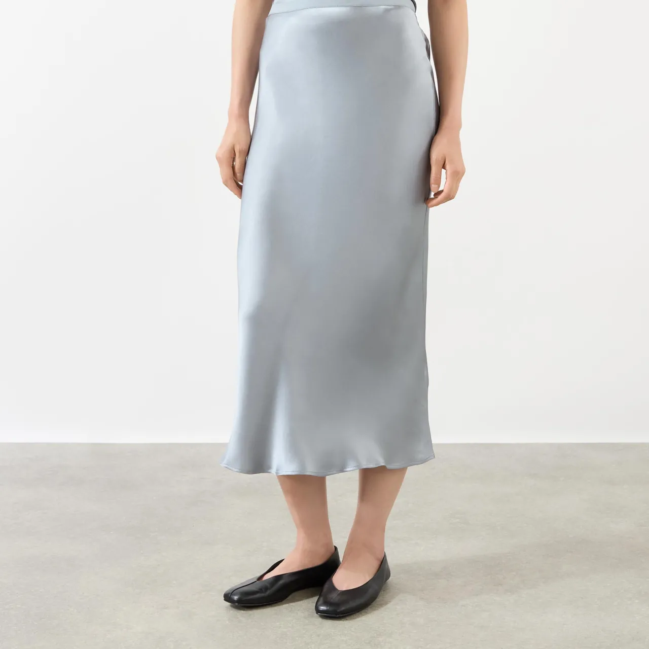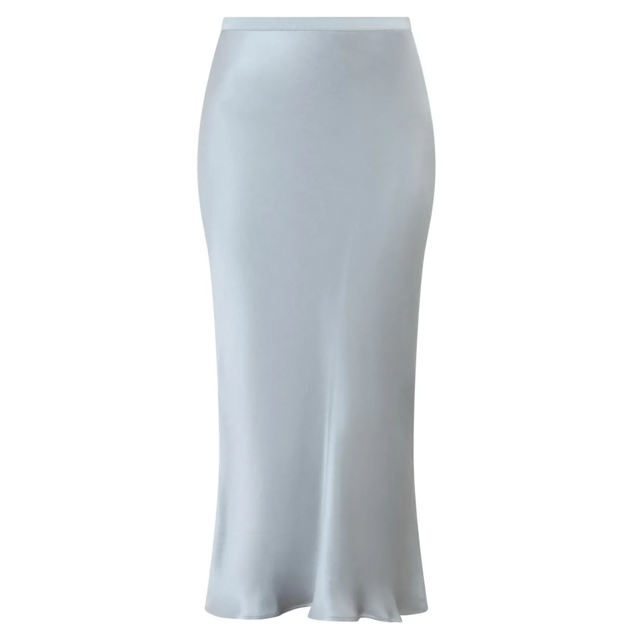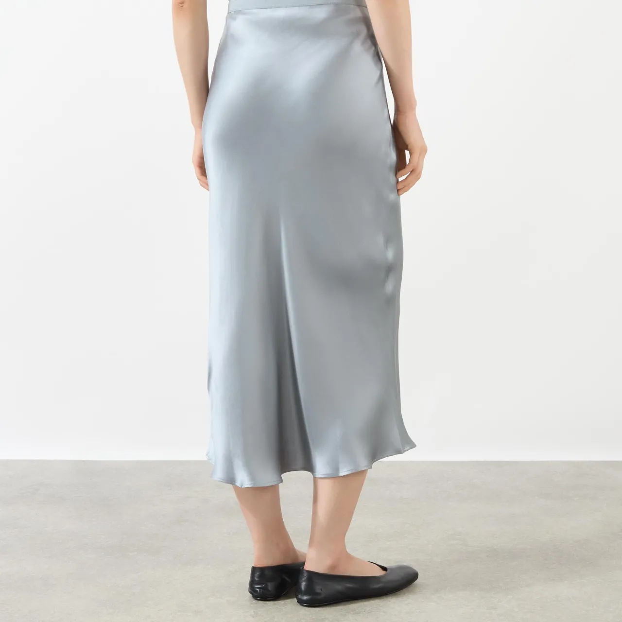 - Elasticated waistband, flared silhouette, midi length, smooth silk finish