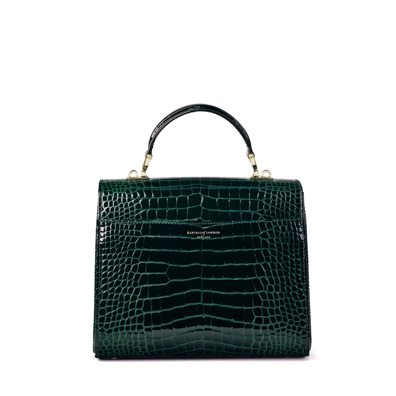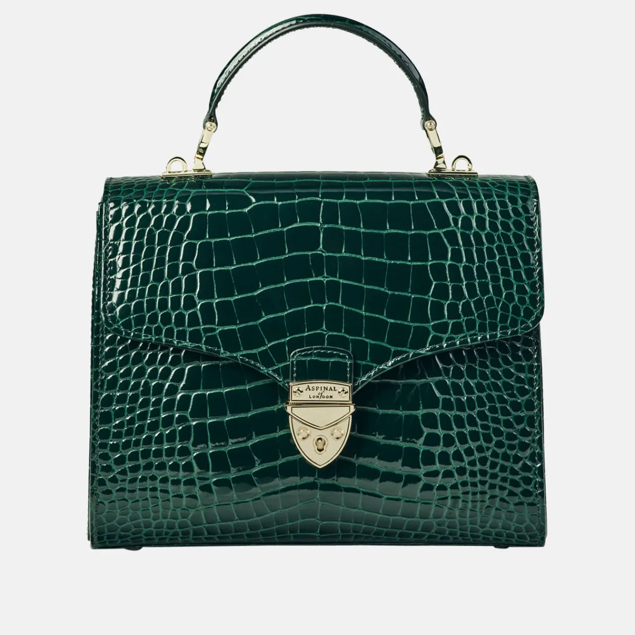 - Top handle, patent leather, signature shield lock fastening, grosgrain lining, detachable crossbody strap, brand logo details, gold-tone hardware, purse feet