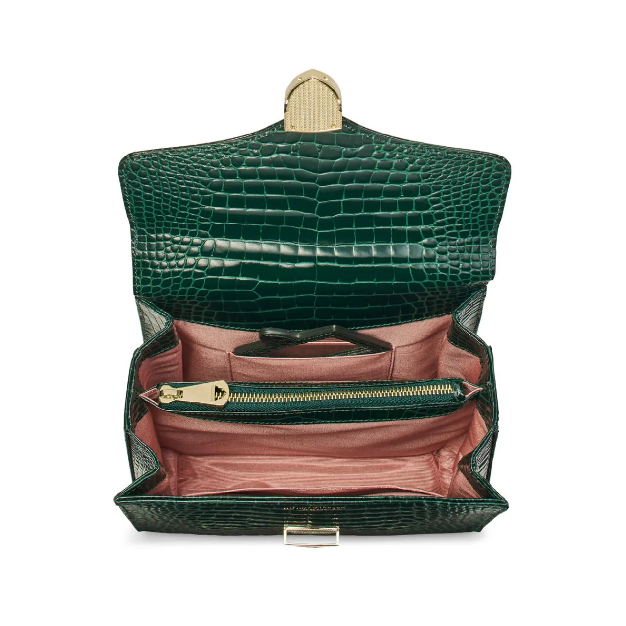 - Interior: One main compartment, one central zipped pocket, open slip pockets, compact mirror