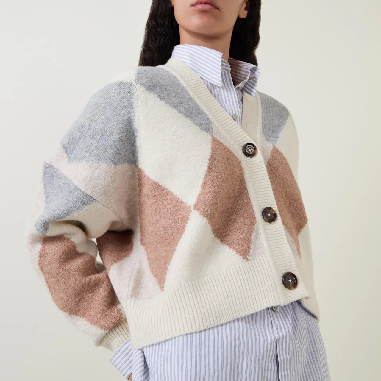 - V-neckline, dropped shoulders, long sleeves, front button fastening, straight hem, straight hem, ribbed trims, diamond design, rear logo plaque, soft finish