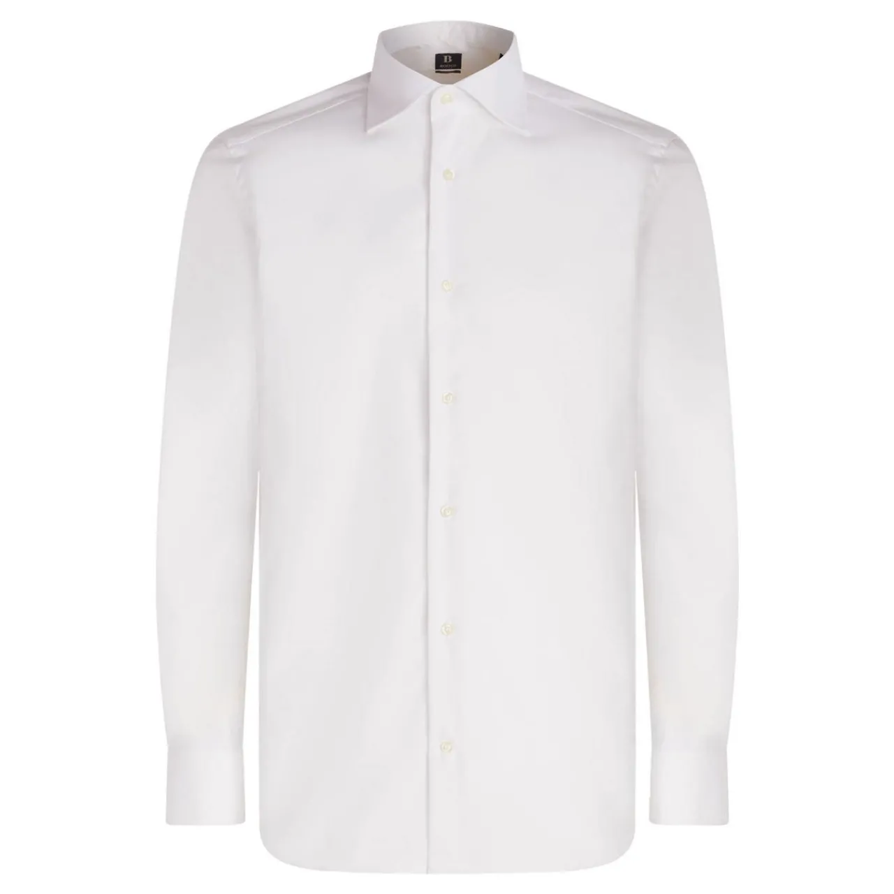 - Crease resistant, long sleeves, pointed collar, curved hemline, button fastenings, single cuffs