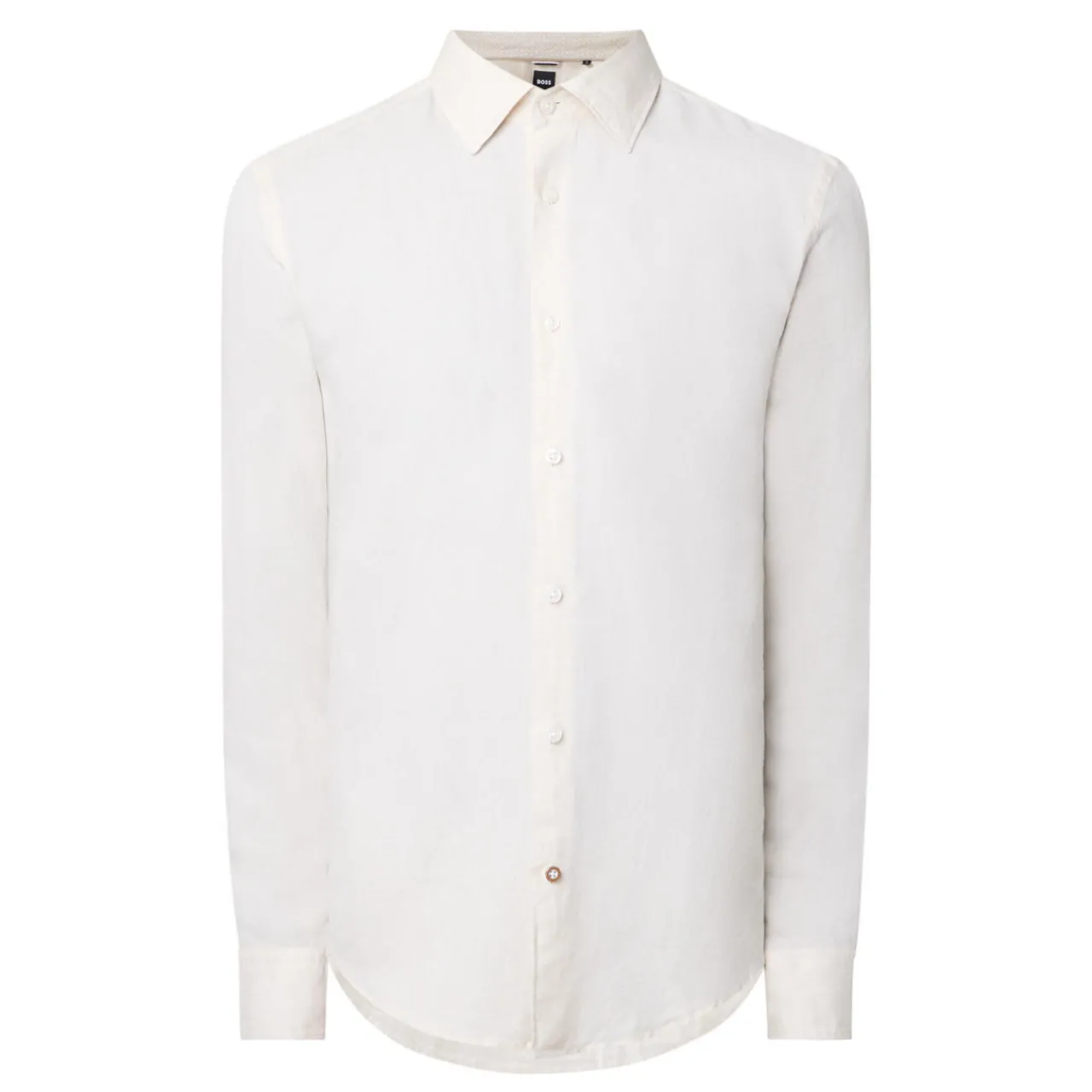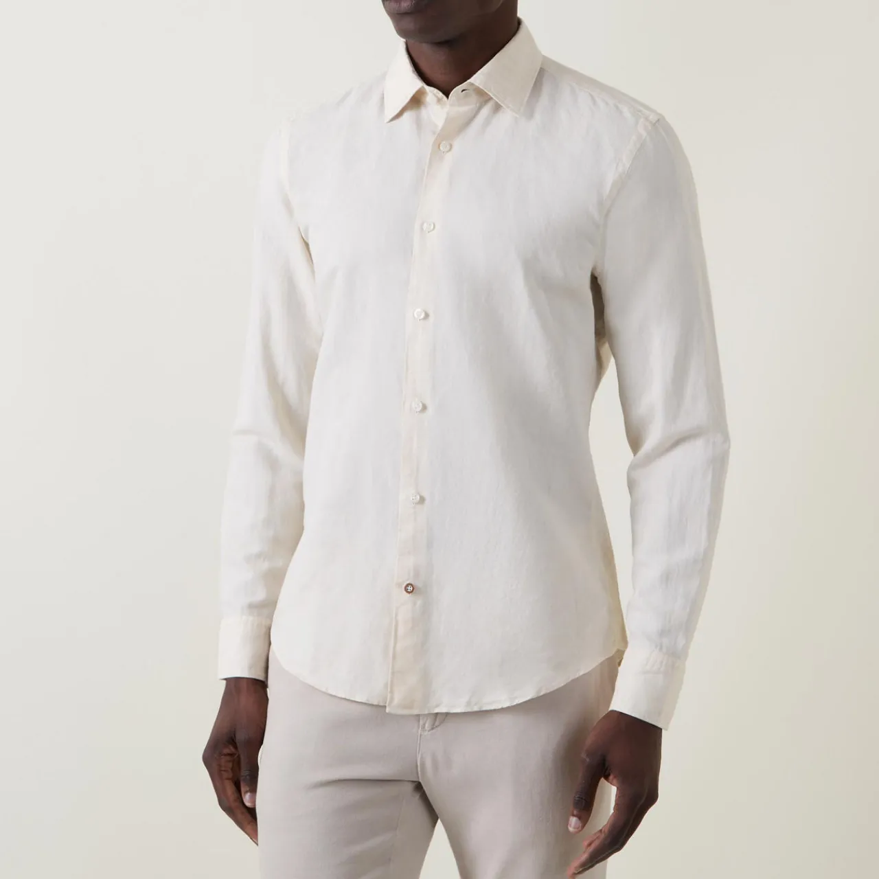 - Pointed collar, long sleeves, button fastening, tonal stitching, single-button cuffs, curved hemline, smooth fabric