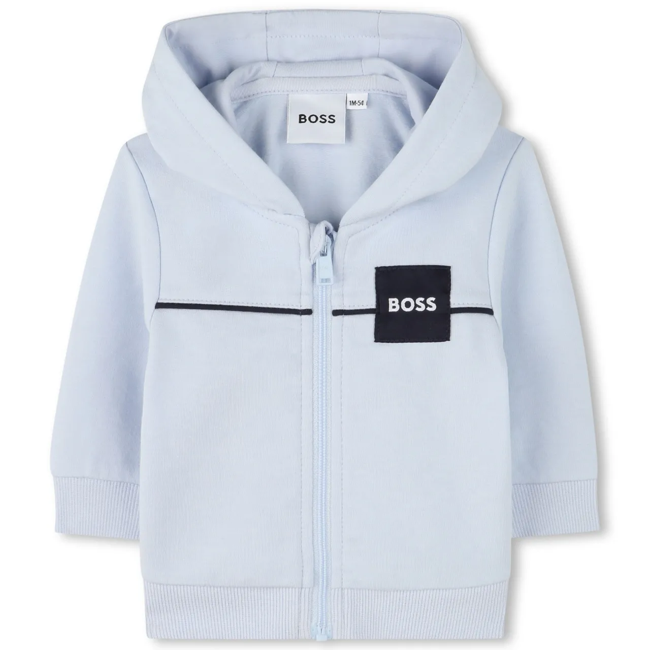 - Hoodie: Hood, brushed fleece finish, striped logo band, woven logo sticker on the side, front zip fastening. Track Pants: Brushed fleece finish, striped bands on the sides, woven logo side label. Top: Long sleeves, logo print, snap opening at the shoulder
