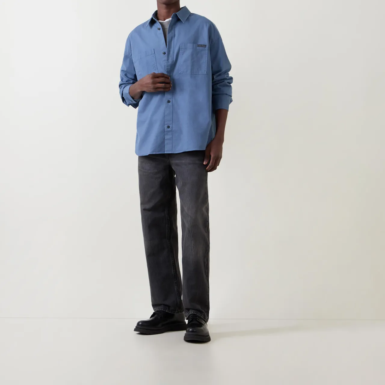 - Point collar, long sleeves, dropped shoulders, front button placket, two chest patch pockets, logo patch, tonal stitching, single-button cuffs, curved hemline, smooth fabric
